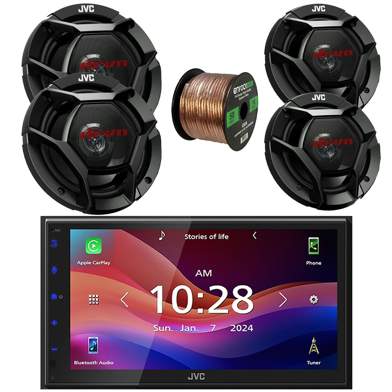 PACKAGE BUNDLE INCLUDES: JVC KW-M690BW 6.8" Capacitive Monitor Single-DIN Bluetooth USB/MP3 Digital Media Shallow Chassis Multimedia Receiver, 2x JVC Mobile CS-DR1721 drvn DR Series 6.75" 300 Watts Max Power Shallow-Mount 2-Way Coaxial Car Audio Speakers, 2x JVC CS-DR621 drvn DR Series 6.5" 300 Watts Max Power 2-Way Coaxial Automotive Speakers, 50 Feet 16 Gauge Speaker Wire