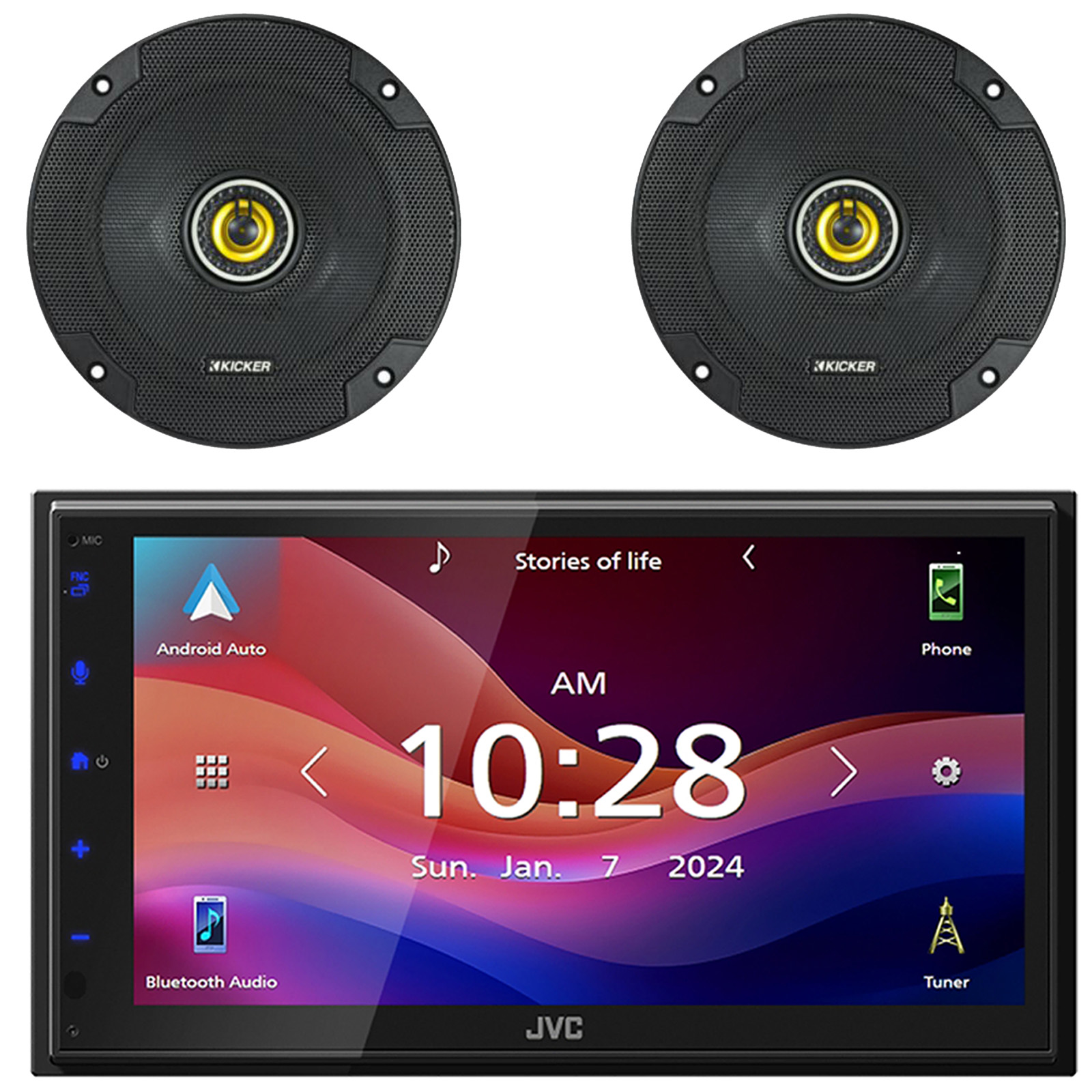 • PACKAGE BUNDLE INCLUDES: JVC KW-M695BW 6.8" WSVGA LCD Display Single-DIN Bluetooth USB/MP3 Digital Media Shallow Chassis Multimedia SiriusXM Ready Receiver, 2x Kicker CSC65 CS Series 6.5" 300 Watts Max Power 2-Way Car Audio Coaxial Speakers