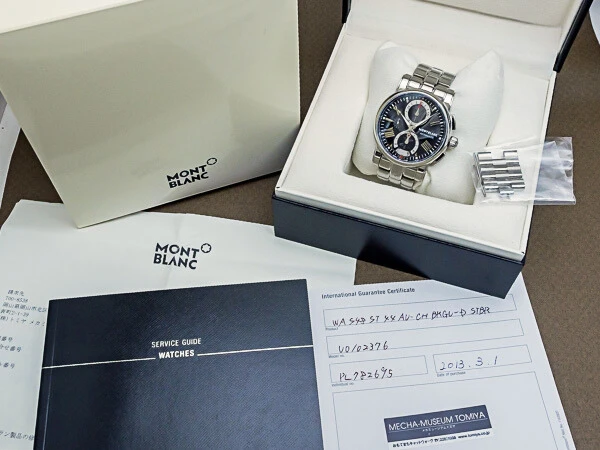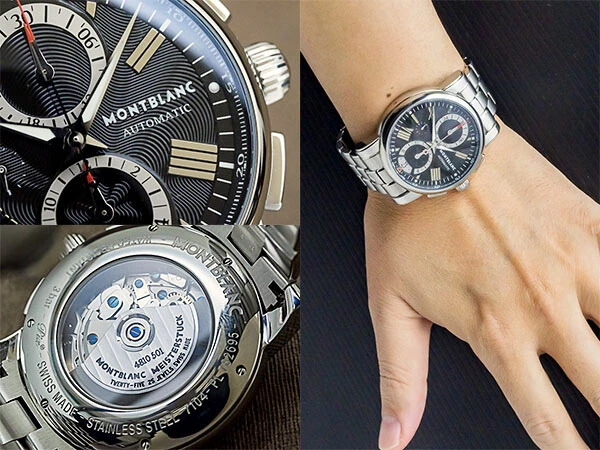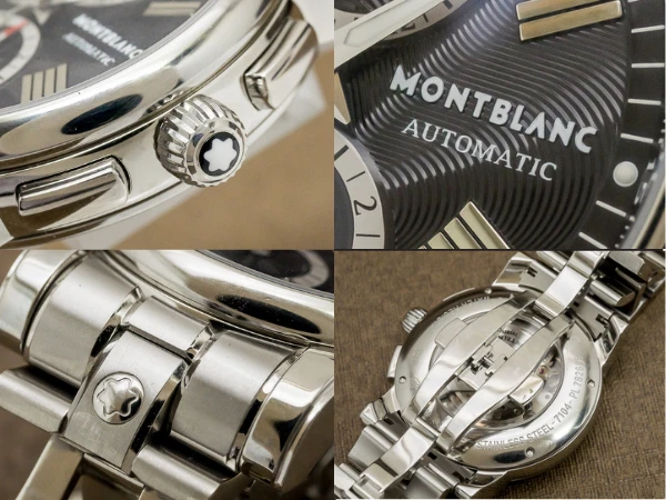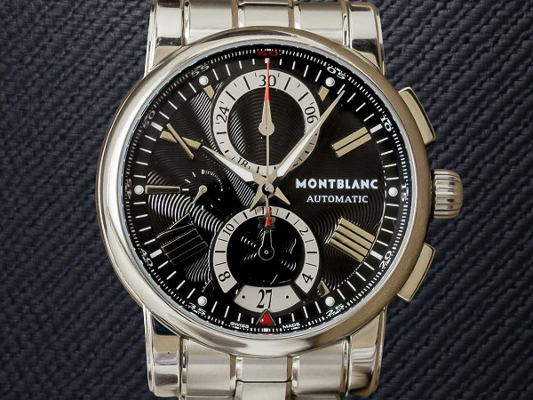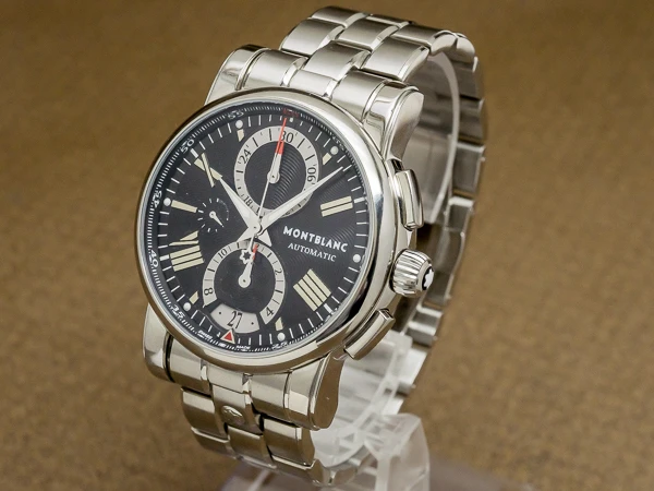 Originally trademarked in 1889 by Suter & Cie in Villeret, Switzerland, Montblanc began its journey crafting premium Swiss movements and watch cases. In 1997, Montblanc Montre S.A. was established in the Jura region, marking a new era for the brand's horological excellence. This model, the Star 4810 Chronograph, features a black dial with an elegant flowing design and Roman numeral appliqué indexes paired with dauphine hands for optimal readability. Sub-dials include a 12-hour counter at 6 o’clock, running seconds at 9, and a 30-minute counter at 12. The chronograph functions and resets operate flawlessly. A date window with quick-set function is located at 6 o’clock. The 44.5mm stainless steel round case makes a bold statement, and the crown is adorned with Montblanc's iconic "White Star" emblem, symbolizing snow atop Europe’s highest peak. The exhibition caseback showcases the intricately decorated movement. The stainless steel bracelet features a push-button double-folding clasp with the Montblanc logo engraved on the inside.