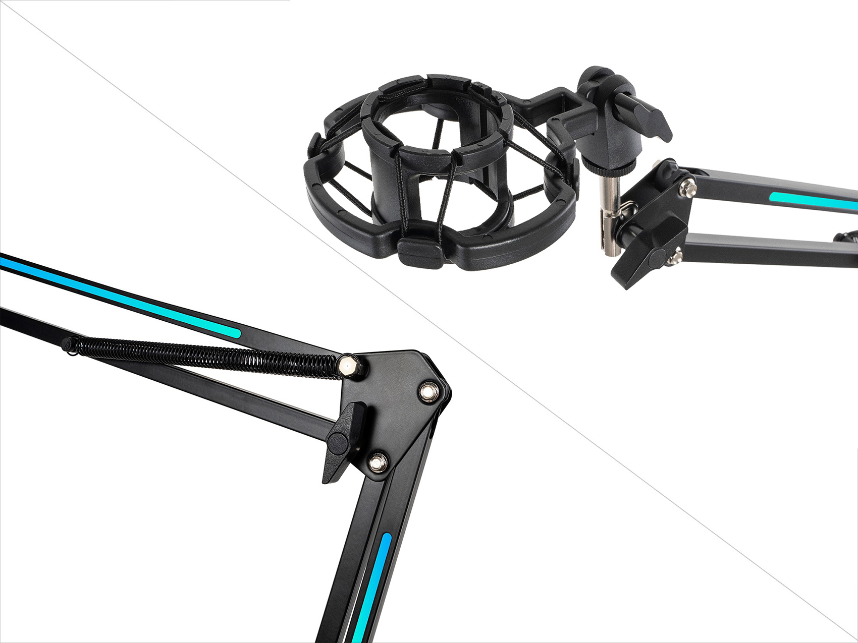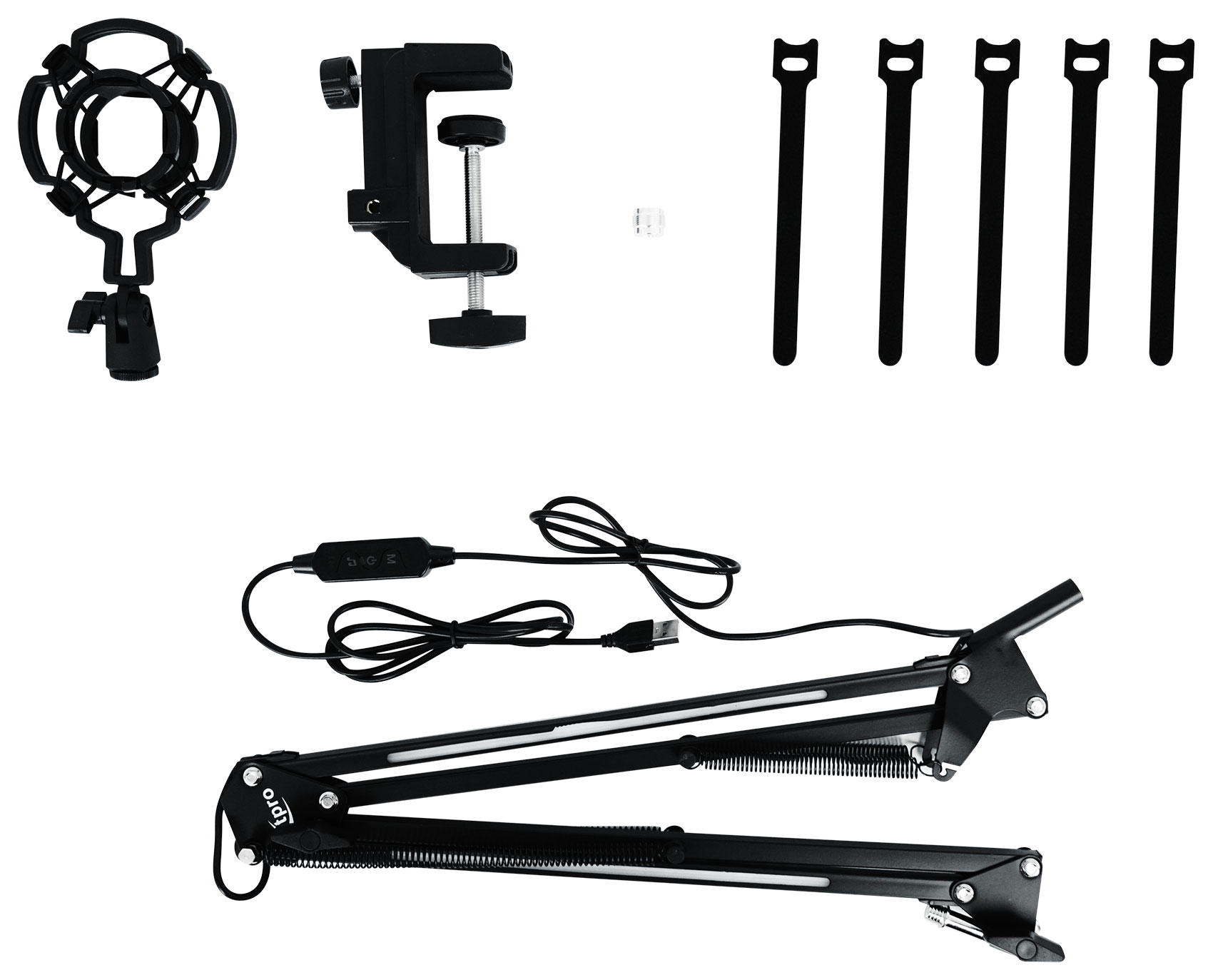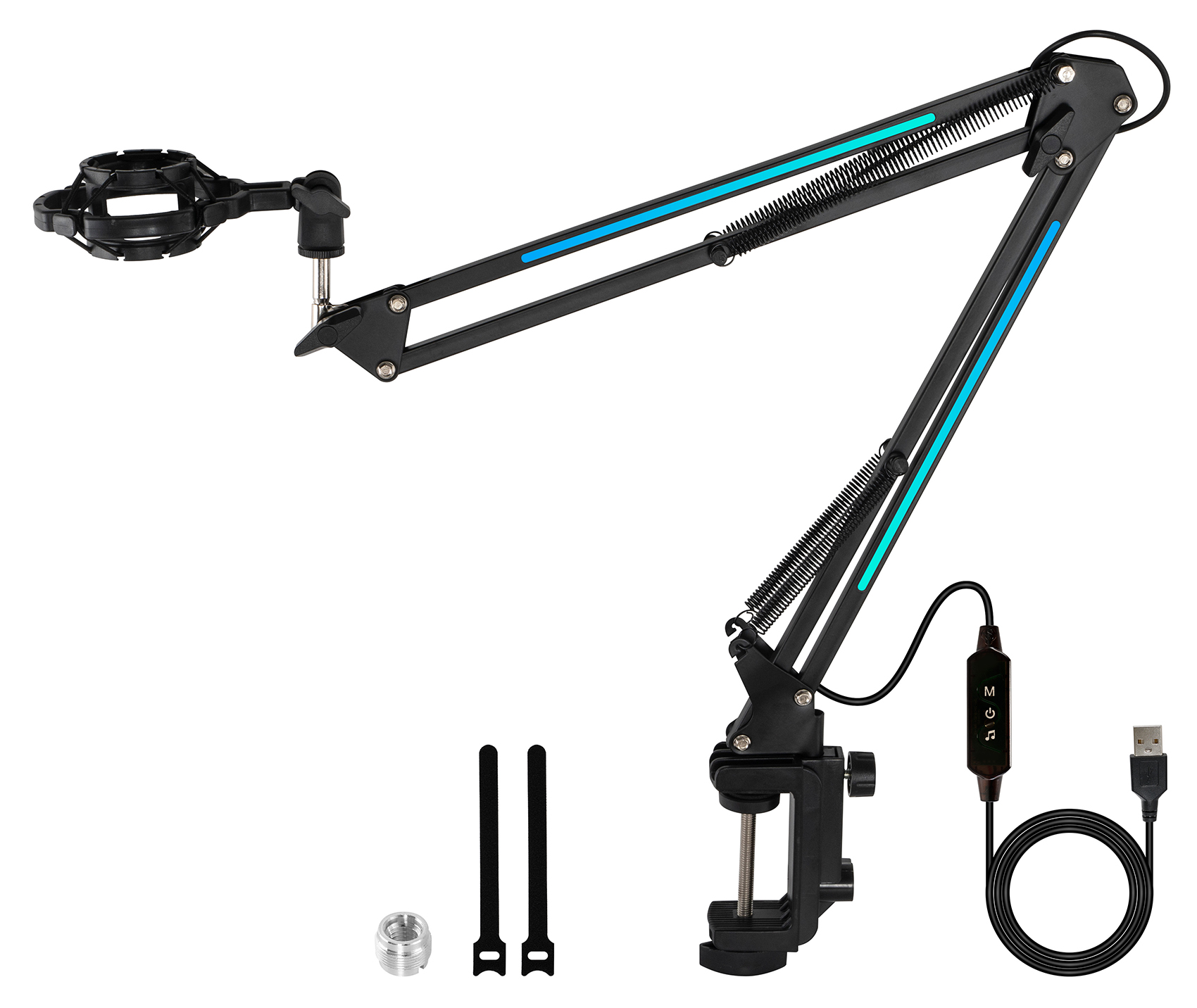 Comprehensive Kit: Includes the LED microphone arm, spider mic holder, table clamp, 3/8" to 5/8" screw adapter, 4 cable ties, and a user manual.
