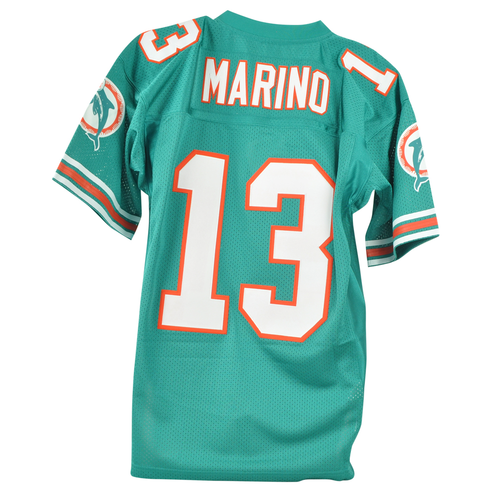 Description: Show the love for your favorite player of all time with this jersey. This Mitchell & Ness 1994 Throwback jersey features stitched player number on jersey front; stitched player last name and number on jersey back. Front and back body with mesh fabric. Dolphins logo screen printed on the sleeves. Authentic Throwback woven jock tag. Material 100% Polyester. Color Teal. Authentic Merchandise. Officially Licensed Product. Brand new item with tags.
