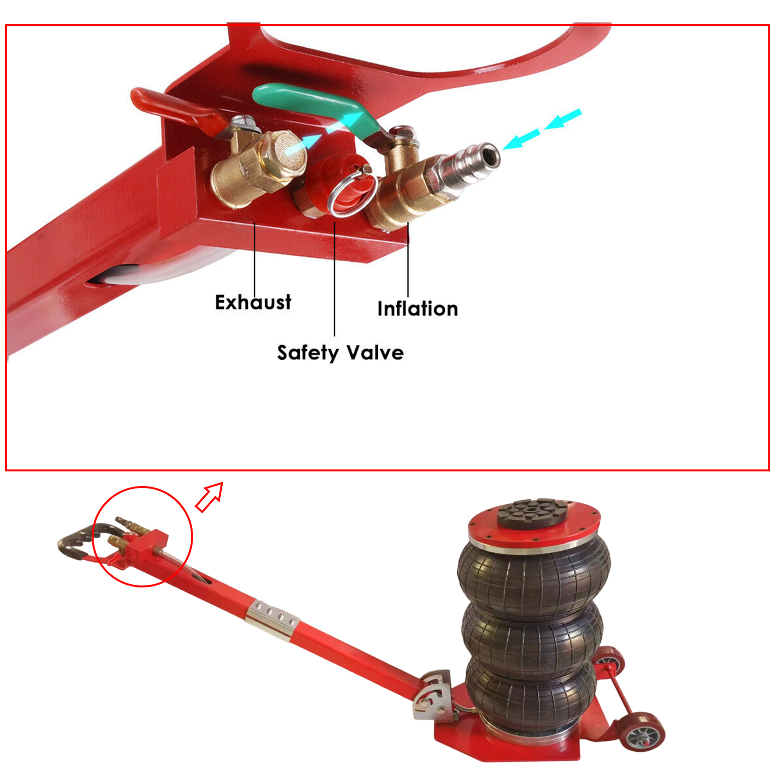 - Tragbarer Handgriff: Dieser Airbag-Wagenheber hat einen langen Griff, der den Wagenheber leicht zu bewegen und zu benutzen macht. Und dieser Griff kann aus der Mitte demontiert werden, was Platz spart und es für Sie geeignet macht, in Ihrem Kofferraum zu halten.