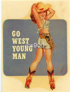"Go West Young Man," orders a sexy cowgirl armed with a six shooter, ten gallon hat, and spurs, on this unique vintage souvenir water decal produced in the early 1950's by Bloom Brothers/Mastercraft Decalcomania.