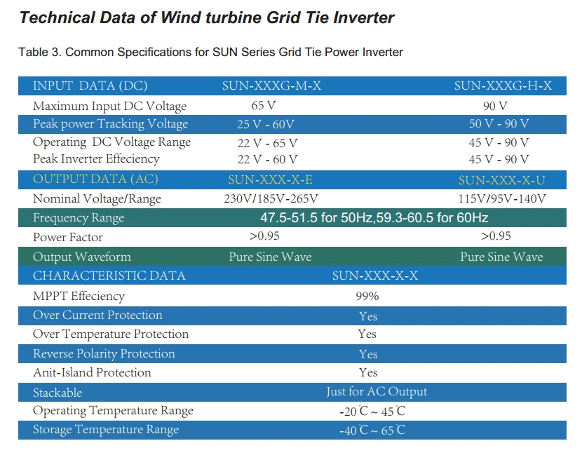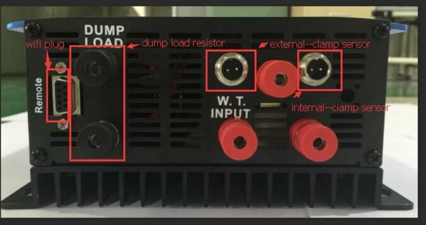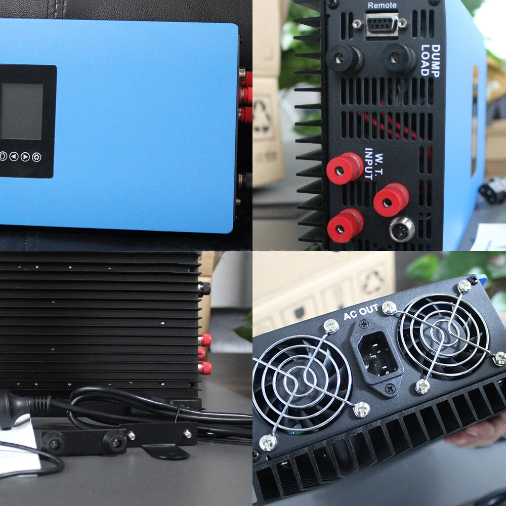 - Eingebauter Dump Load Controller - dreiphasiger Wechselstromeingang von der Windkraftanlage - Einphasiger Wechselstrom zum Netz (220 V 230 V 240 V) - Eingebaute Leistungsbegrenzungsfunktion