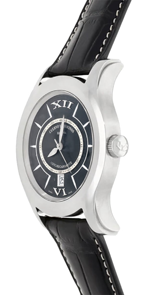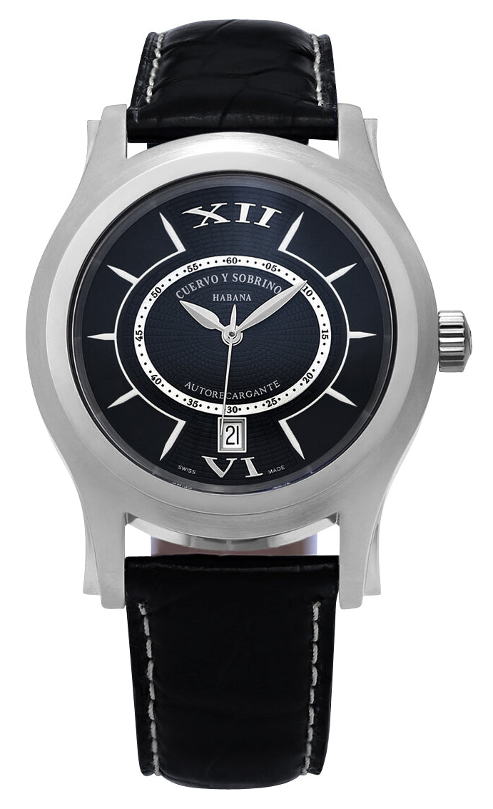 Named after a thick and short cigar used by former British Prime Minister Sir Winston Churchill when he visited Cuervo y Sobrinos in the past. The distinguished Robusto collection celebrates the brand's rich heritage with their exquisite timepieces. This Robusto Solo Tiempo features a 43 mm stainless steel case with a polished fixed bezel that holds a black guilloche dial under a double curved sapphire crystal. The intricate design spans the top, center, and bottom of the dial while the periphery has a matte finish. It has silver-tone leaf hands and white obelisk-shaped indices with applied silver-tone Roman numerals at the 6 and 12 o'clock positions as hour markers. Complementing this classic dress watch are stepped lugs, a signed screw-down crown, an inner minutes scale ring, and a bordered date aperture at the 6 o'clock position. It is fitted with a black leather strap and secured by a stainless steel signed buckle. The exhibition case back highlights the caliber CYS 8126, a Swiss automatic movement beating at 28,800 vibrations per hour, generating 38 hours of power reserve and is water-resistant up to 100 meters/330 feet.