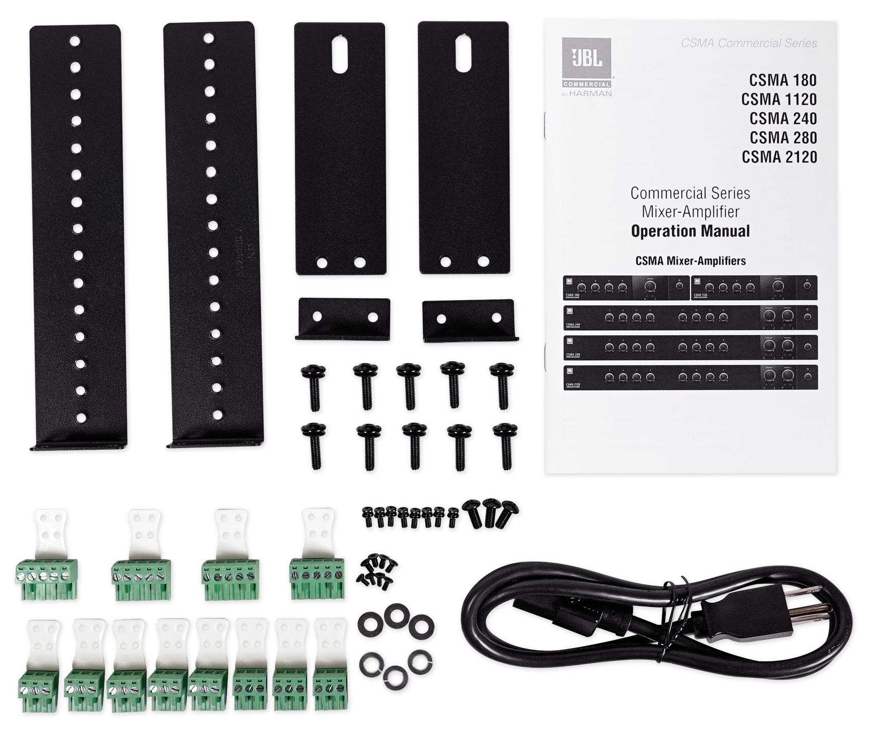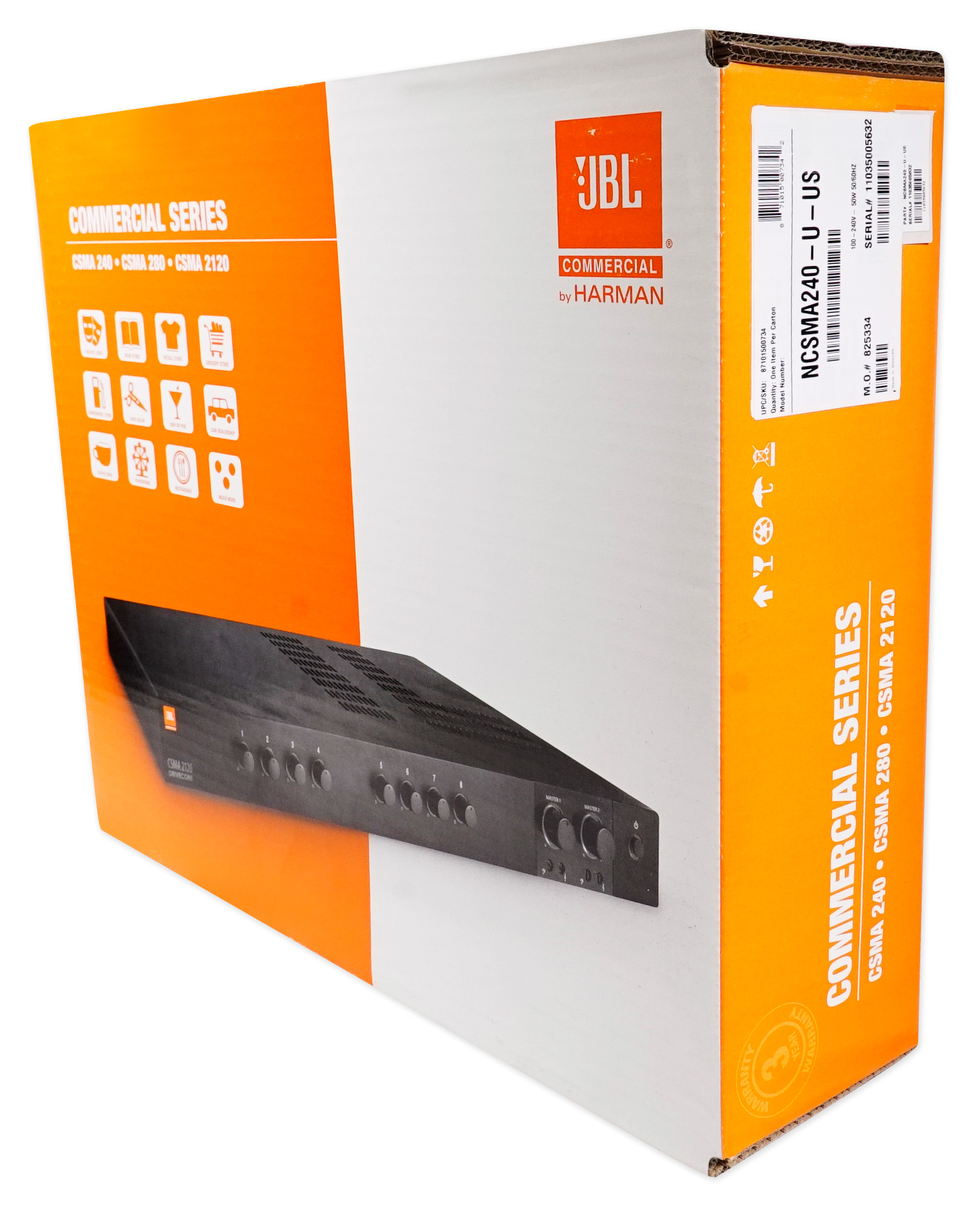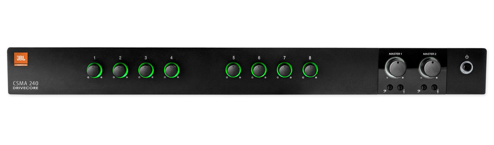 Designed for commercial and industrial use, the CSMA 240 Commercial Series Mixer/Amplifier from JBL is a mixer/amplifier with eight mixer-channel inputs and two output channels. It's capable of reaching 40W of peak power with 5W per channel. The unit's front panel sports volume controls for each channel, as well as two master volume adjustment knobs, two sets of bass and treble controls, and a power switch. The volume controls are illuminated so they can be seen and operated in darkened environments.