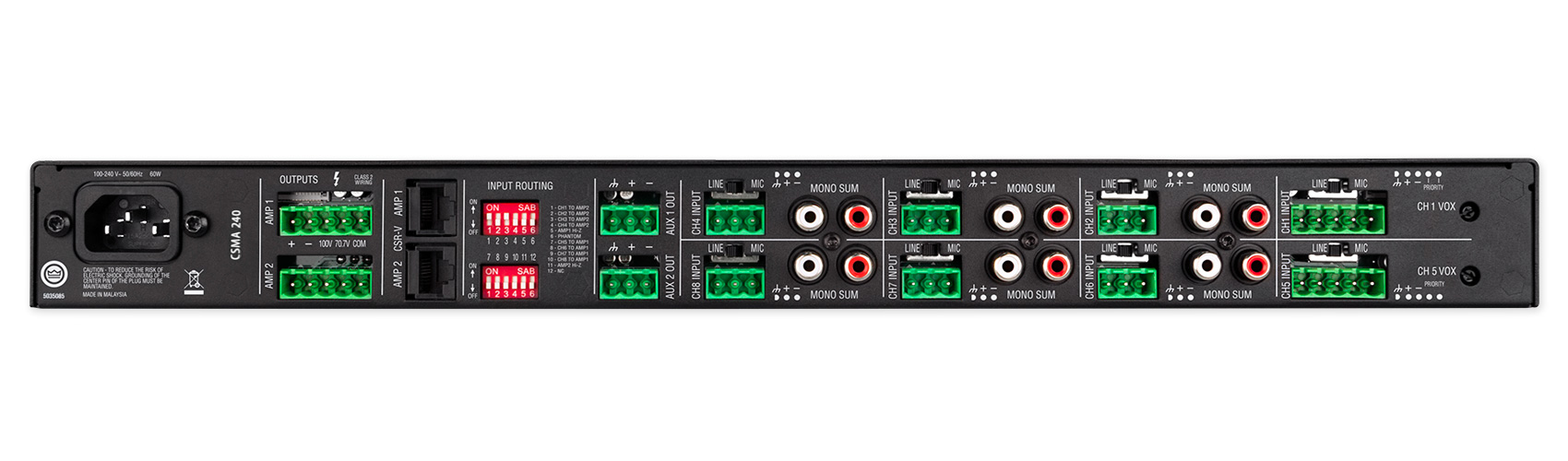 The amplifier, capable of driving both eight and four Ohm loads, can be used with 70V and 100V distributed audio systems without the need for a separate transformer. On its back panel you'll find euroblock connections for mic/line inputs, as well as unbalanced RCA inputs, speaker connections, dip switches for input routing, and more. The unit is also equipped with two RJ45 connectors for use with JBL CSR-V in-wall volume controls (available separately).