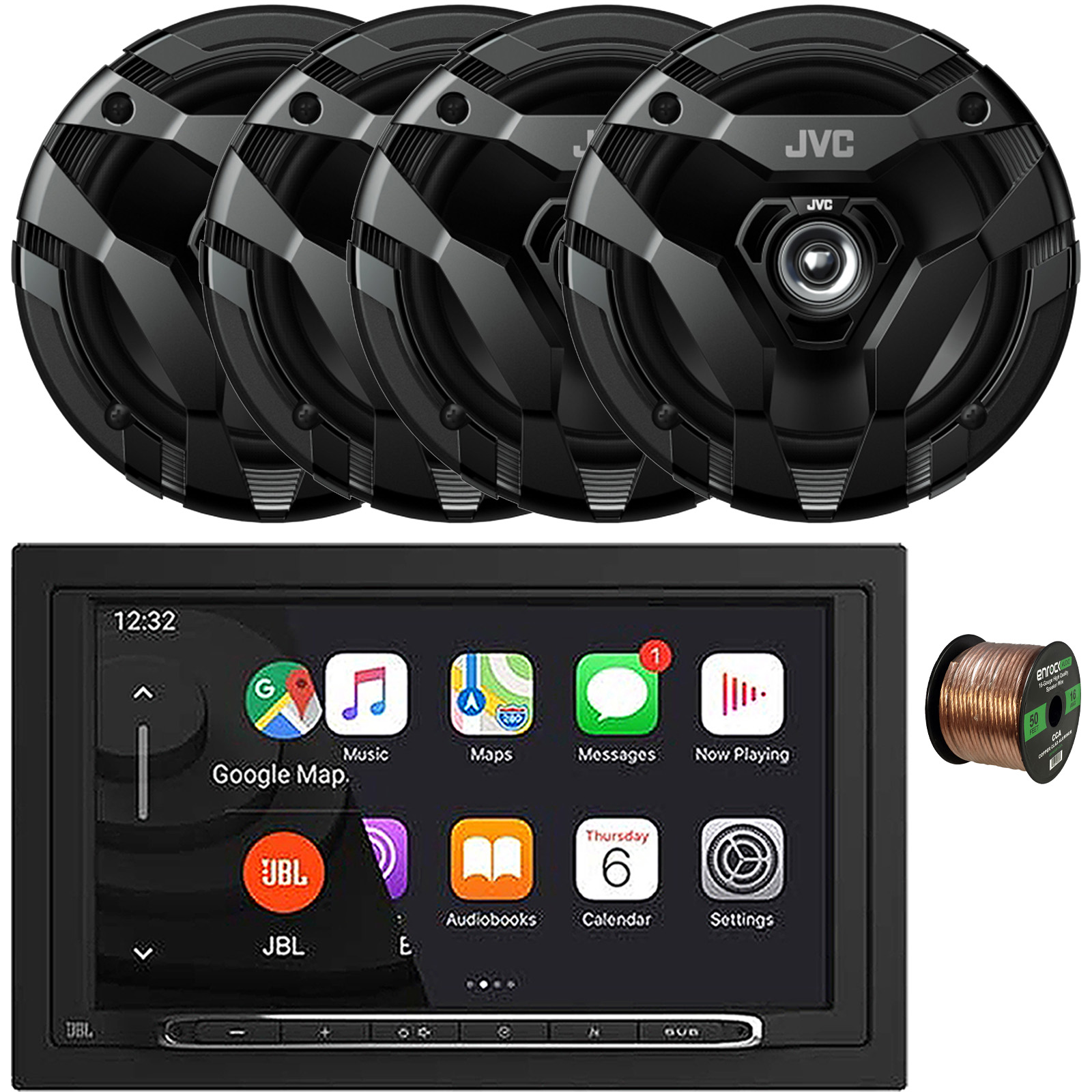 PACKAGE BUNDLE INCLUDES: JBL Legend 700 7” Touchscreen Display Double-DIN Mechless Bluetooth AM/FM Receiver W/Wireless Apple CarPlay & Android Auto, 4x JVC CS-DF620 drvn DF Series 6.5" 300 Watts Max Power 2-Way Coaxial Car Audio Speakers, 50 Feet 16 Gauge Speaker Wire