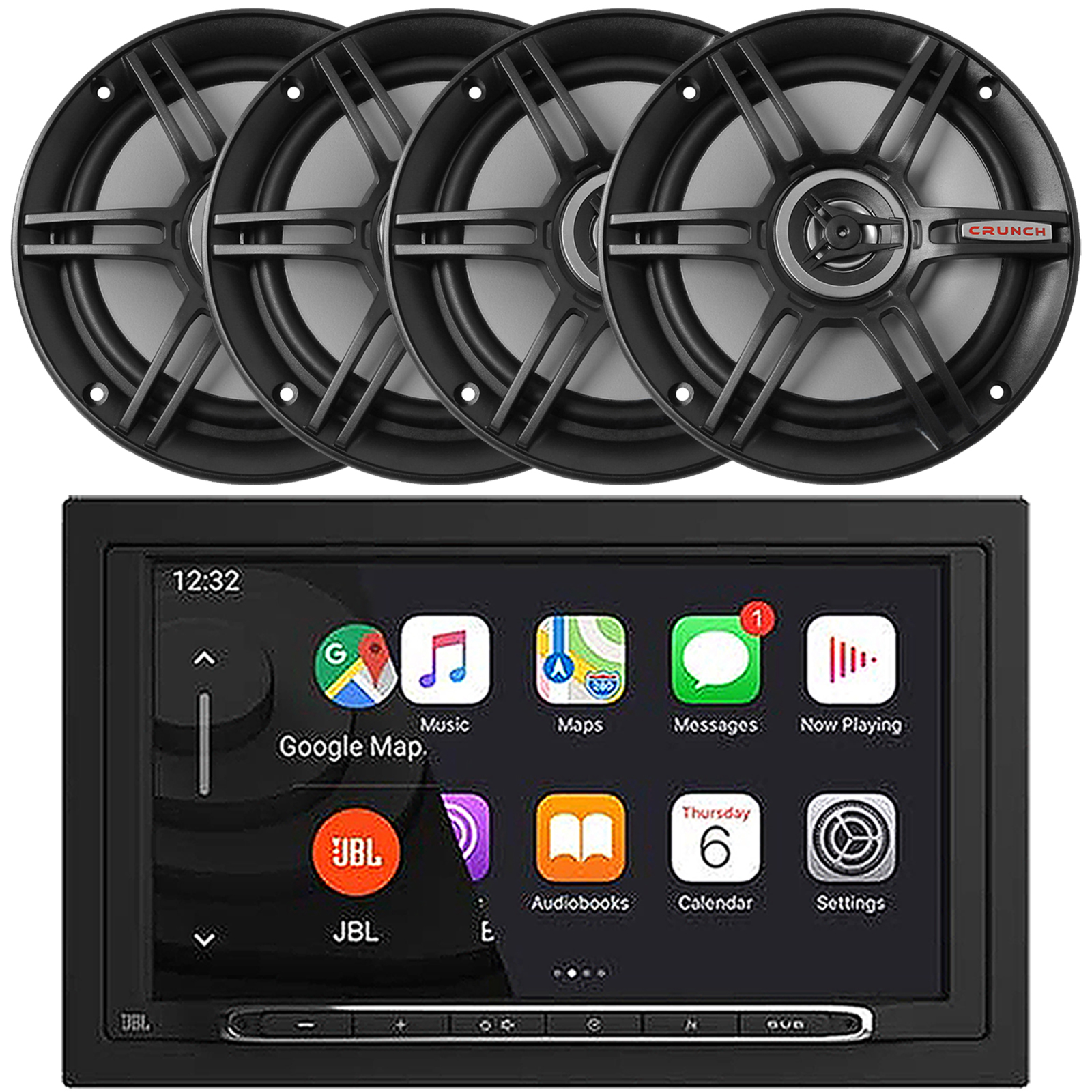 PACKAGE BUNDLE INCLUDES: JBL Legend 700 7” Touchscreen Display Double-DIN Mechless Bluetooth AM/FM Receiver W/Wireless Apple CarPlay & Android Auto, 4x Crunch CS65CXS 6.5" 300 Watts Max Power 2-Way Shallow Mount Full Range Car Audio Speakers