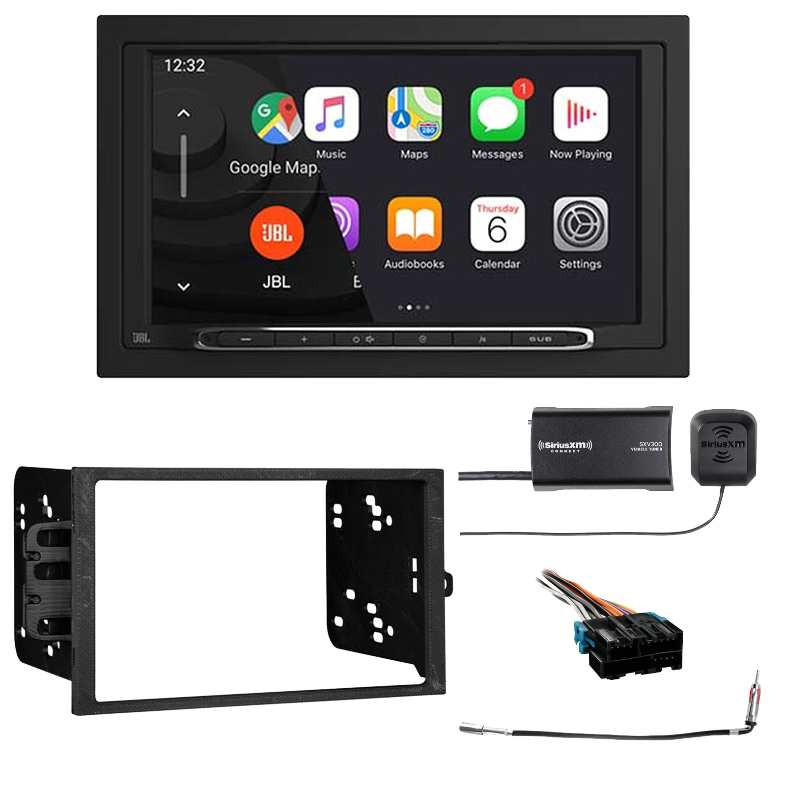 PACKAGE BUNDLE INCLUDED: JBL Legend 700 7” Touchscreen Display Double-DIN Mechless Bluetooth AM/FM Receiver W/Wireless Apple CarPlay & Android Auto W/Double-DIN Installation Dash Kit, Satellite Radio Vehicle Tuner Kit for Satellite Radio, Radio Wiring Harness, Antenna Adapter (Bundle Fits 1988-2005)