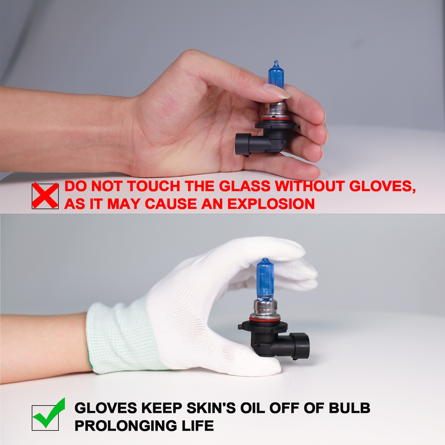 Please wear gloves when installing the halogen bulb and do not touch the glass surface of the halogen lamp directly with your hands! Moisture from your hands that is transferred to the bulbs will reduce the life span and quality of the output of the bulbs.