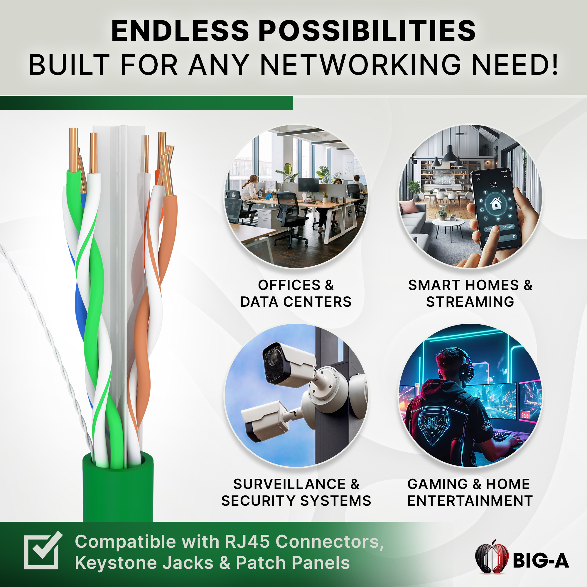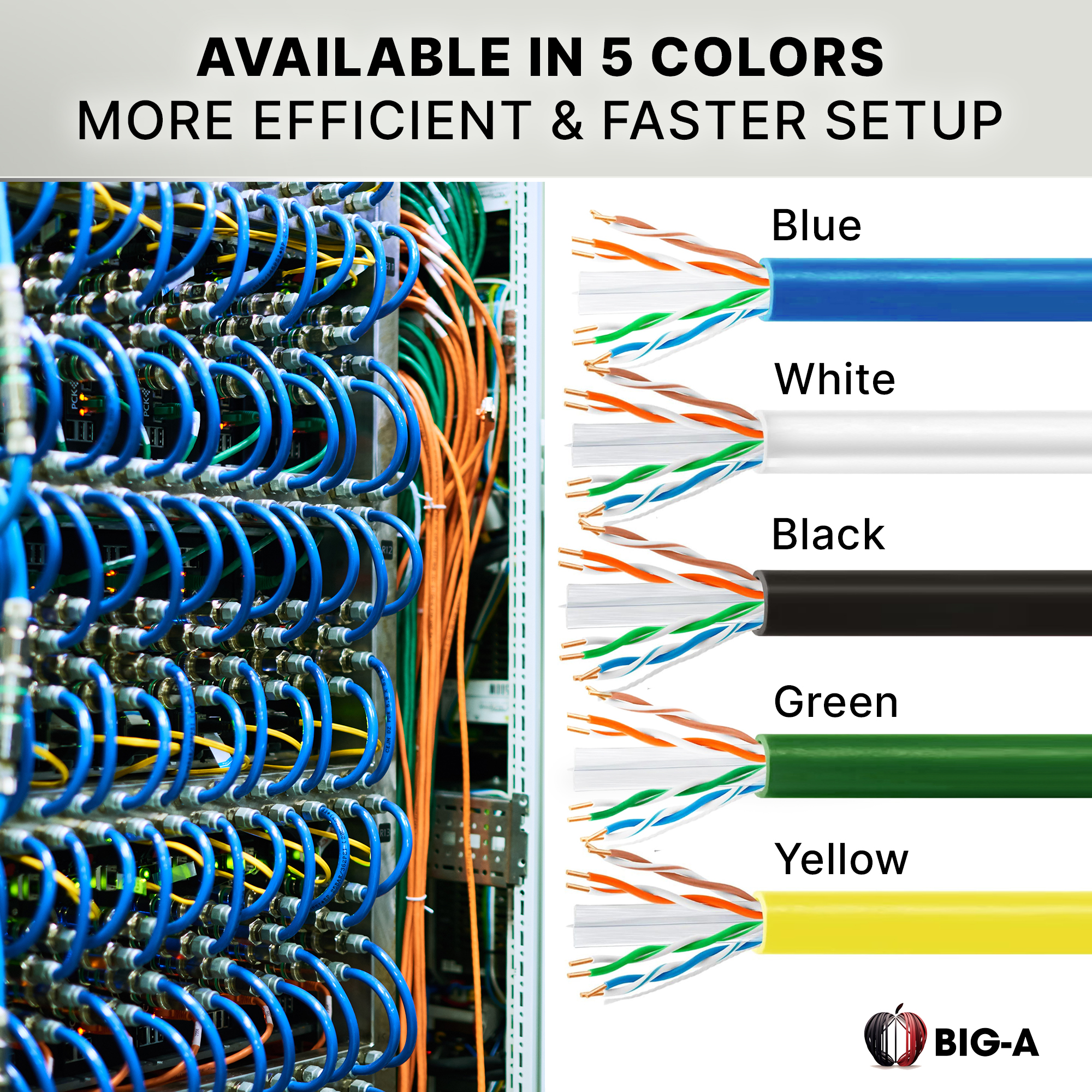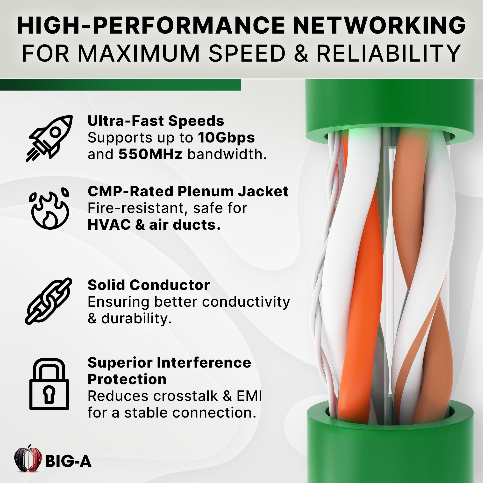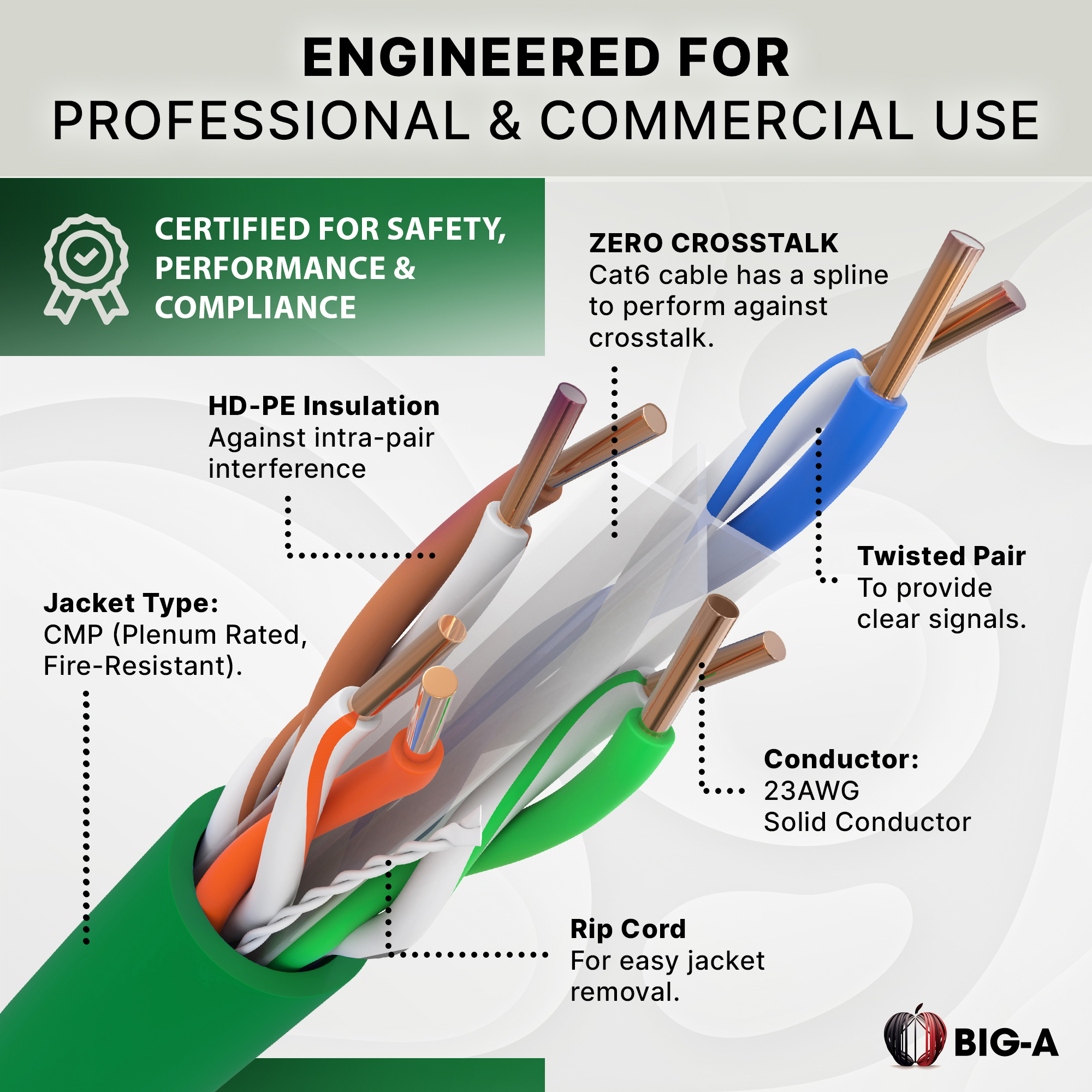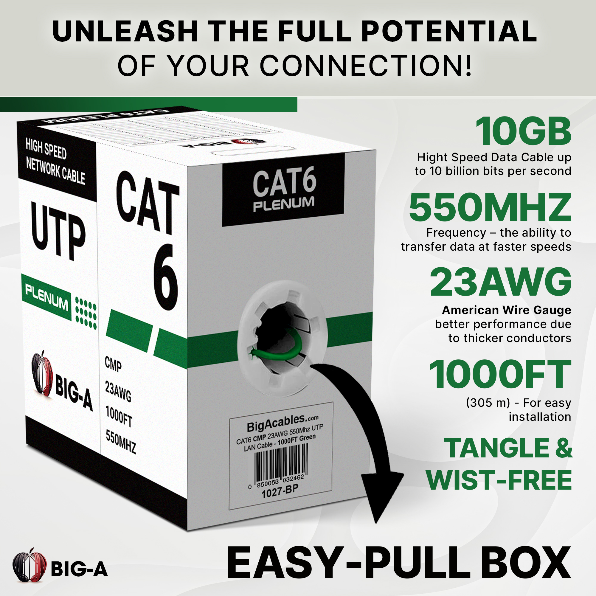 Why Choose Big-A Cat 6 Plenum Cable? Superior Data Transfer – Supports up to 10Gbps Ethernet speeds with 550MHz bandwidth, ensuring smooth, high-speed performance. Plenum-Rated for Safety – Meets CMP fire and safety regulations, making it ideal for air ducts, drop ceilings, and enclosed spaces. UTP Construction – Designed to reduce signal interference and enhance transmission clarity. Easy Pull Box Design – Comes in a 1000ft tangle-free spool, making installations faster and hassle-free.