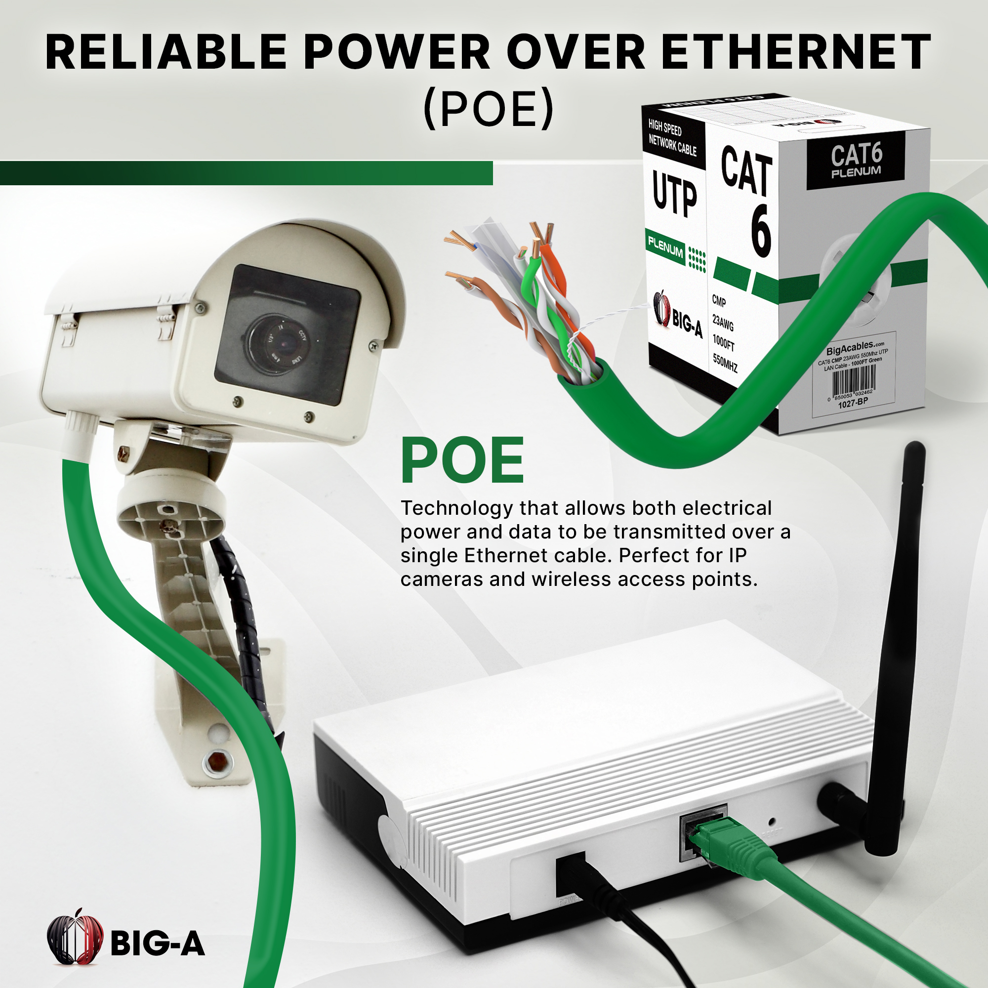 Power up your network with the Big-A Plenum Cat 6 Ethernet Cable, a professional-grade solution for high-speed data transmission in commercial and residential setups. With a CMP plenum rating, this 1000ft bulk cable is specifically designed for safe installation in air-handling spaces, such as ceilings and walls, ensuring compliance with industry safety standards.