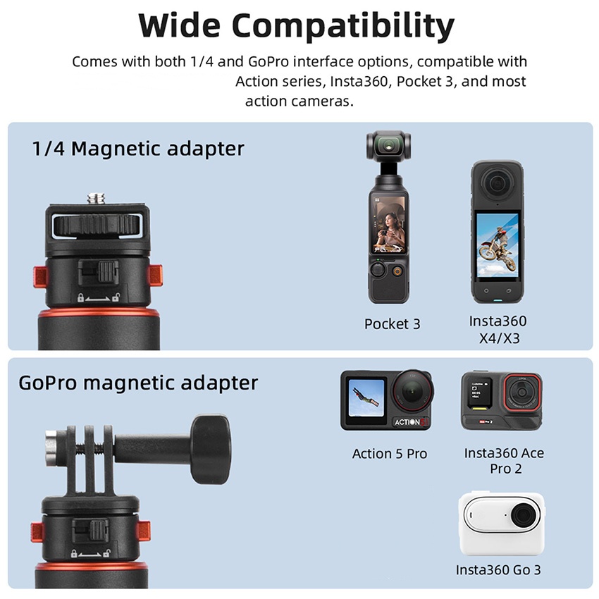 l Compatible with various action cameras, such as Action 5 Pro, Insta360 Go 3S, Pocket 3, smartphones, etc.