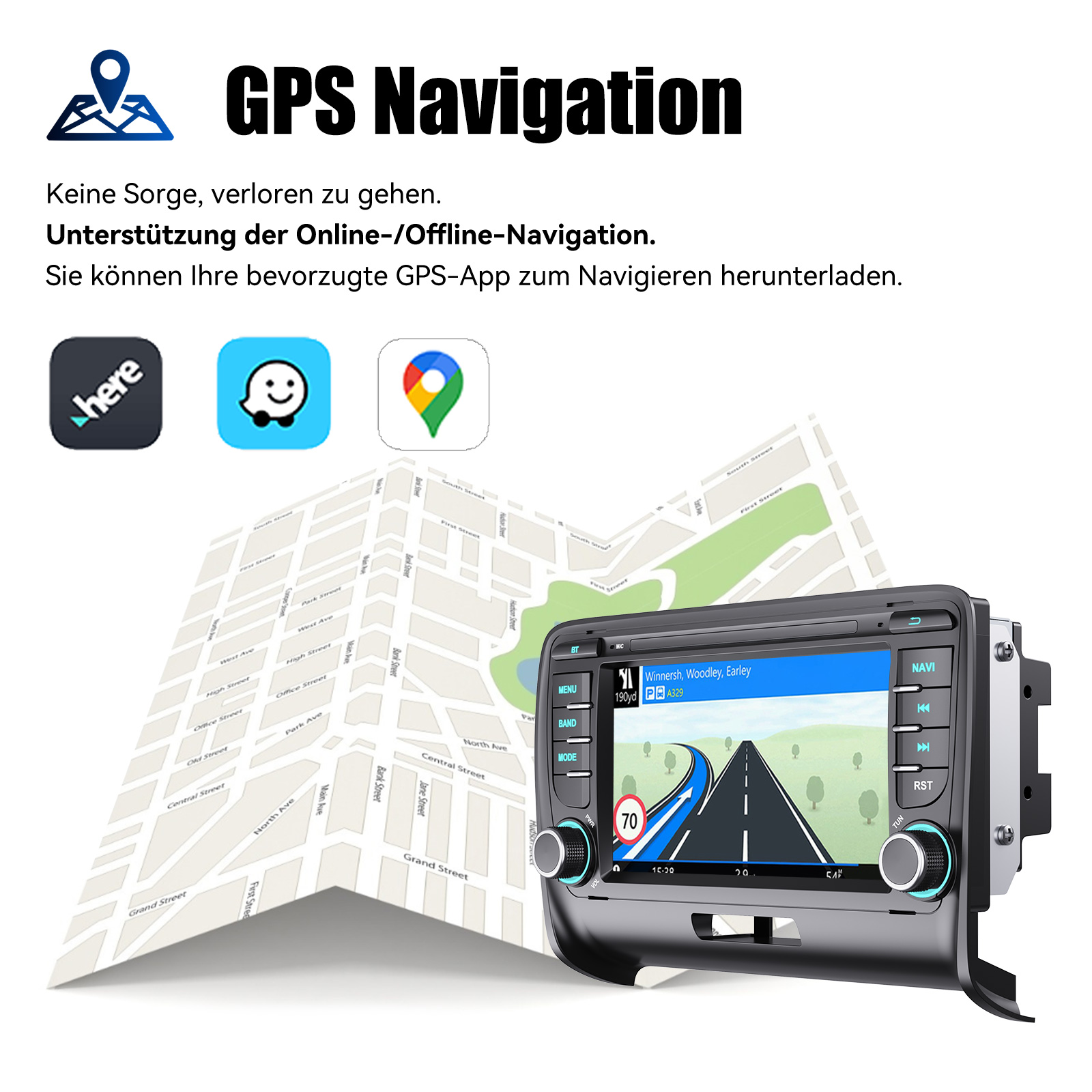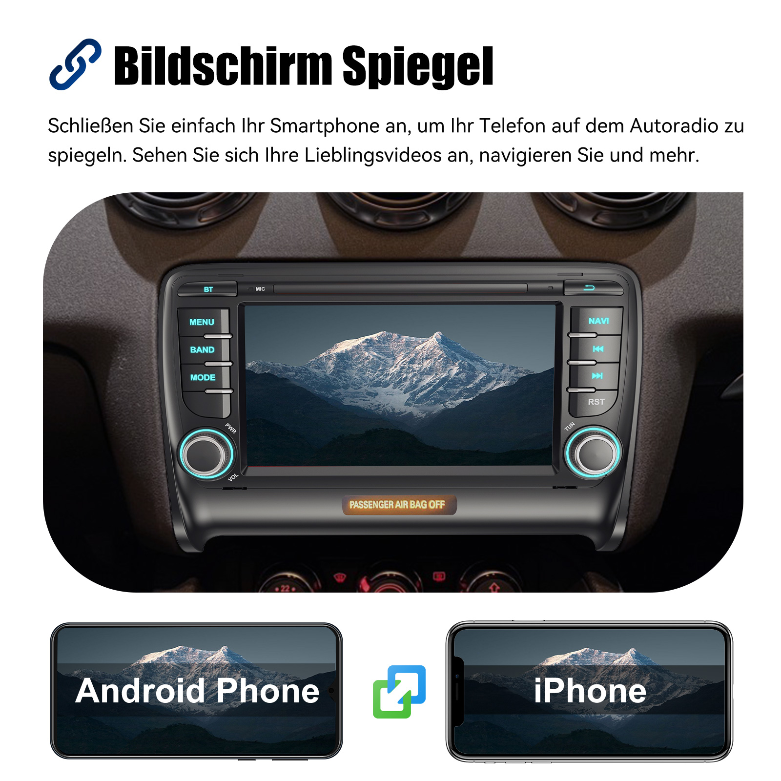 Mirror Link & Apple Carplay & Android Auto: Mit diesem Autoradio erleben Sie die beeindruckende Mirror-Link-Funktion, die mit iOS- und Android-Telefonen kompatibel ist. Sie können den Bildschirm Ihres Smartphones auf das Autoradio spiegeln und dabei Apps wie Google Maps, Spotify, Youtube usw. nutzen. Ersetzen Sie Ihr Mobiltelefon durch den Autobildschirm und verwandeln Sie Ihr Fahrzeug in eine intelligente Plattform. Tauchen Sie ein in ein nahtloses und benutzerfreundliches Infotainment-Erlebnis mit Apple CarPlay & Android Auto. Verbinden Sie Ihr iPhone mit Apple CarPlay oder Ihr Android-Smartphone mit Android Auto und greifen Sie sicher auf Anrufe, Textnachrichten, Navigation, Musik und vieles mehr zu. Mit intuitiver Bedienung über den Touchscreen oder Sprachsteuerung haben Sie alle Funktionen bequem zur Hand, während Sie sicher am Steuer bleiben. Nutzen Sie Ihre bevorzugten Apps und bleiben Sie jederzeit verbunden, während Sie den Blick auf die Straße gerichtet haben. Machen Sie Ihr Fahrzeug zu einem erweiterten Hub für Ihre mobilen Geräte und erleben Sie eine neue Dimension des Infotainments..