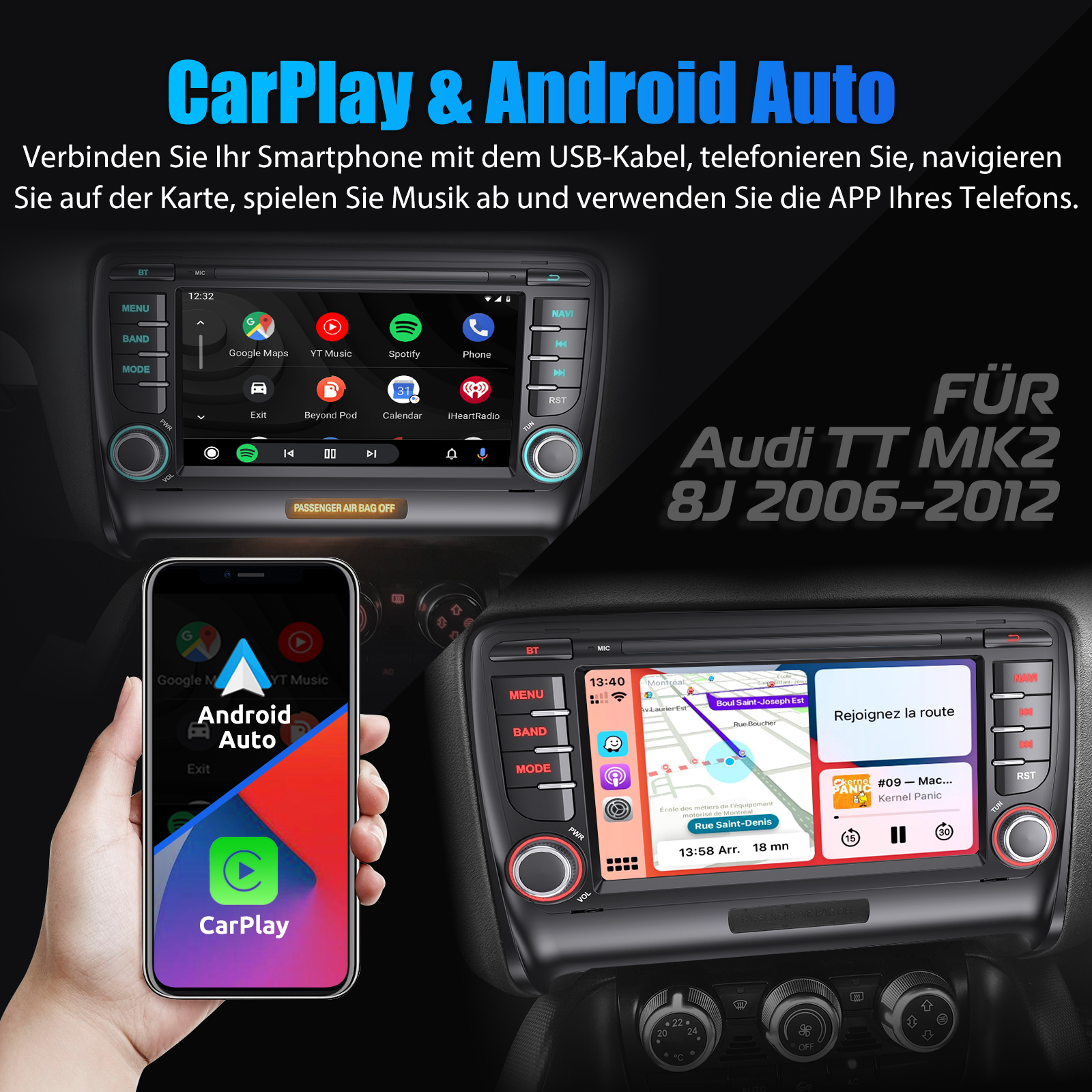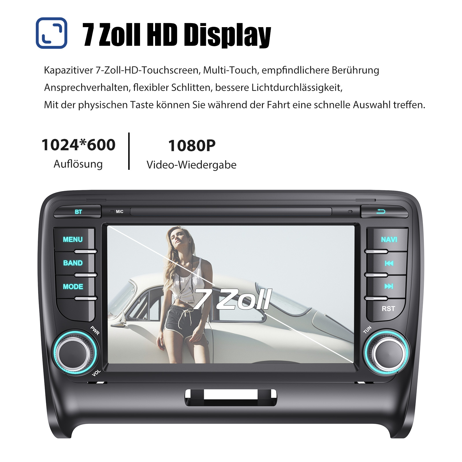 7 Zoll Android 14 Autoradio Für AUDI TT:Das Android Autoradio mit 7" 1024* 600 HD kapazitivem Touchscreen, 2GB RAM und 32GB ROM ermöglicht das Herunterladen Ihrer Lieblings-Apps und -Videos, damit das Autofahren nicht mehr langweilig wird. Kein zusätzlicher Rahmen, kein Kabelwechsel, Plug and Play. Es wird mit Canbus geliefert und unterstützt die meisten Originalfunktionen: Lenkradsteuerung, Rückwärtssignale und Lesen von Original-Computerdaten usw.