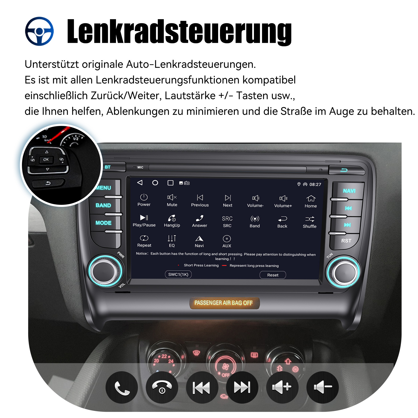 Rückfahrkameraeingang und Lenkradkontrolle: Nach dem Anschluss an die Rückfahrkamera. Das Radio zeigt automatisch das Rückfahrbild an, sobald Sie den Rückwärtsgang einlegen. Machen Sie Ihr tägliches Rückwärtsfahren sicherer. Unterstützt AHD-Kamera. Unterstützt die originale Auto-Lenkradsteuerung (wenn Ihr Auto Canbus nicht unterstützt und SIE die Lenkradtasten lernen), um das Fahren bequemer und sicherer zu machen.