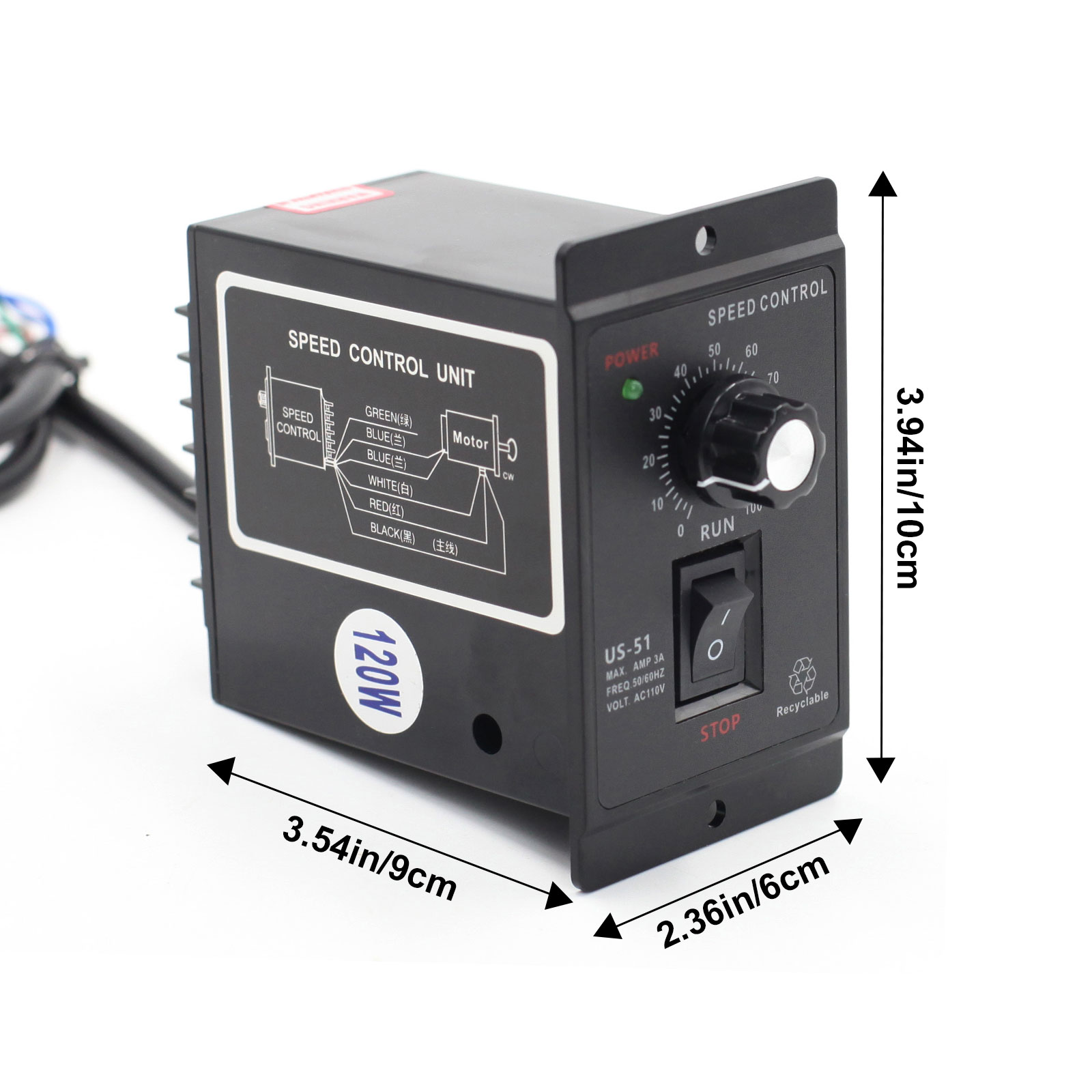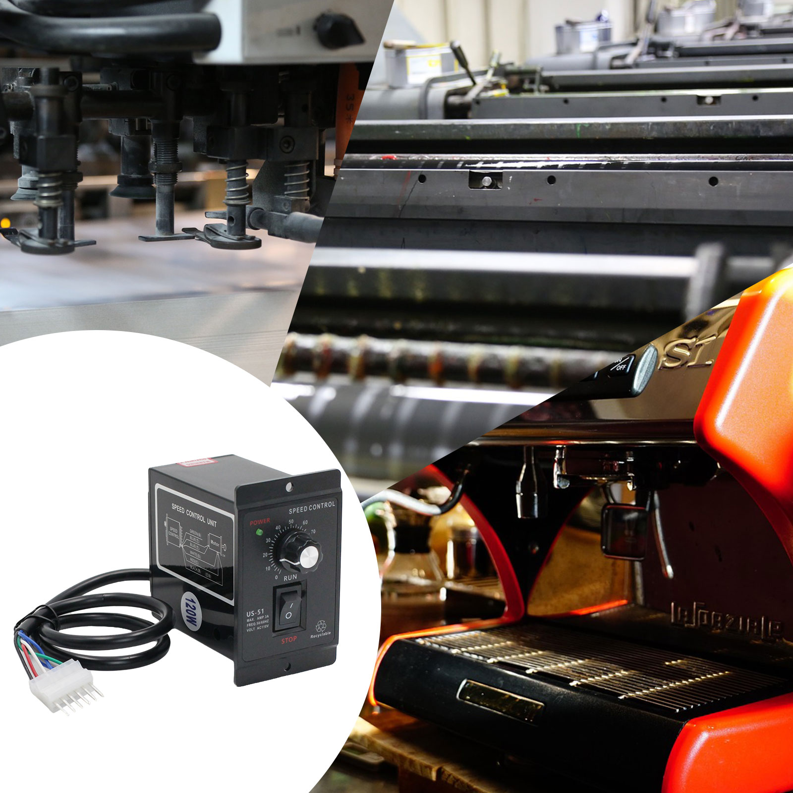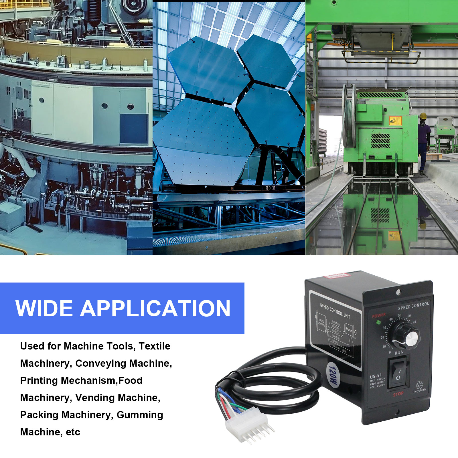Green LED indicator, 6 terminals, on/ off switch for controlling, the knob switch for adjust the speed.Used for Machine Tools, Textile Machinery, Conveying Machine, Printing Mechanism,Food Machinery, Vending Machine, Packing Machinery, Gumming Machine, etc. I