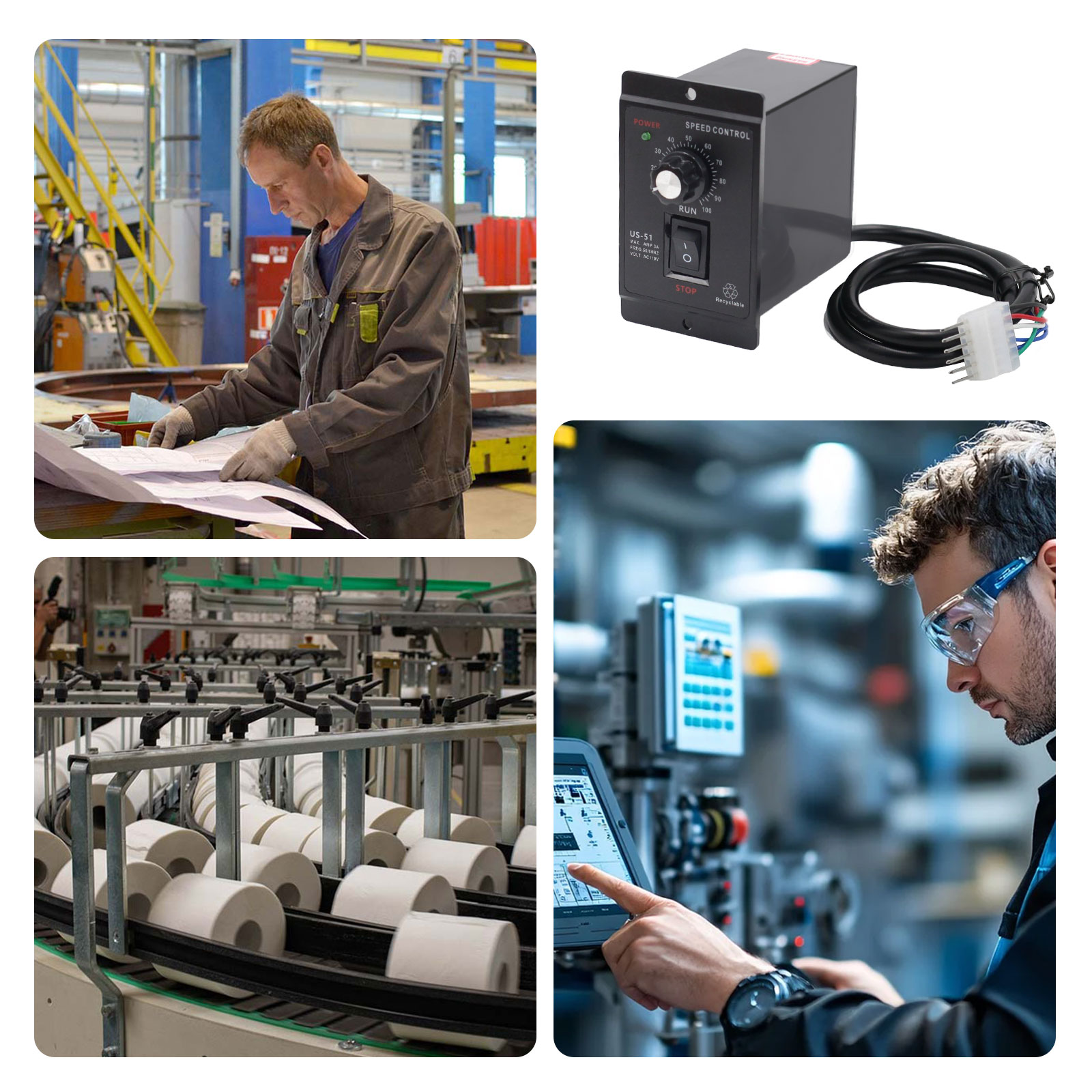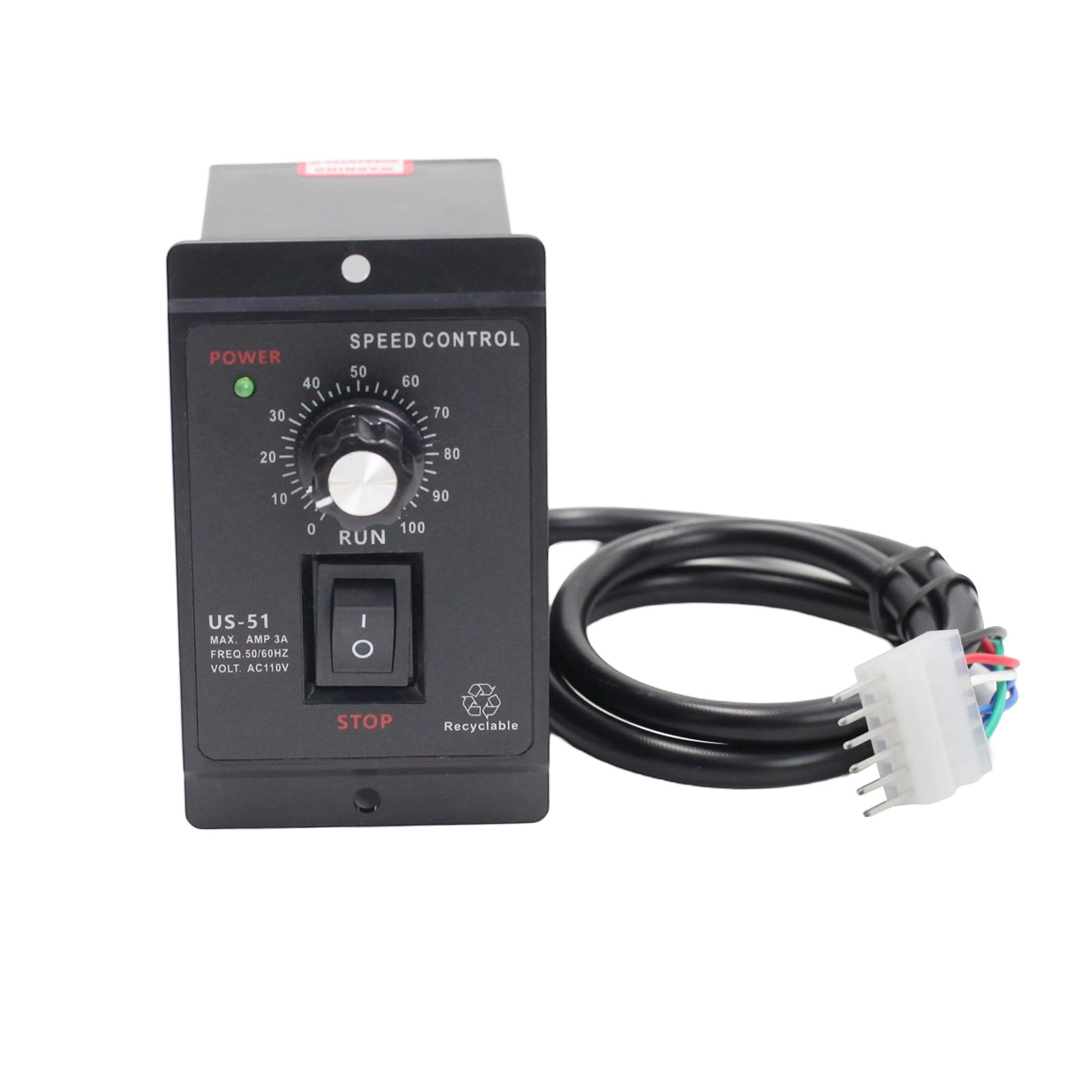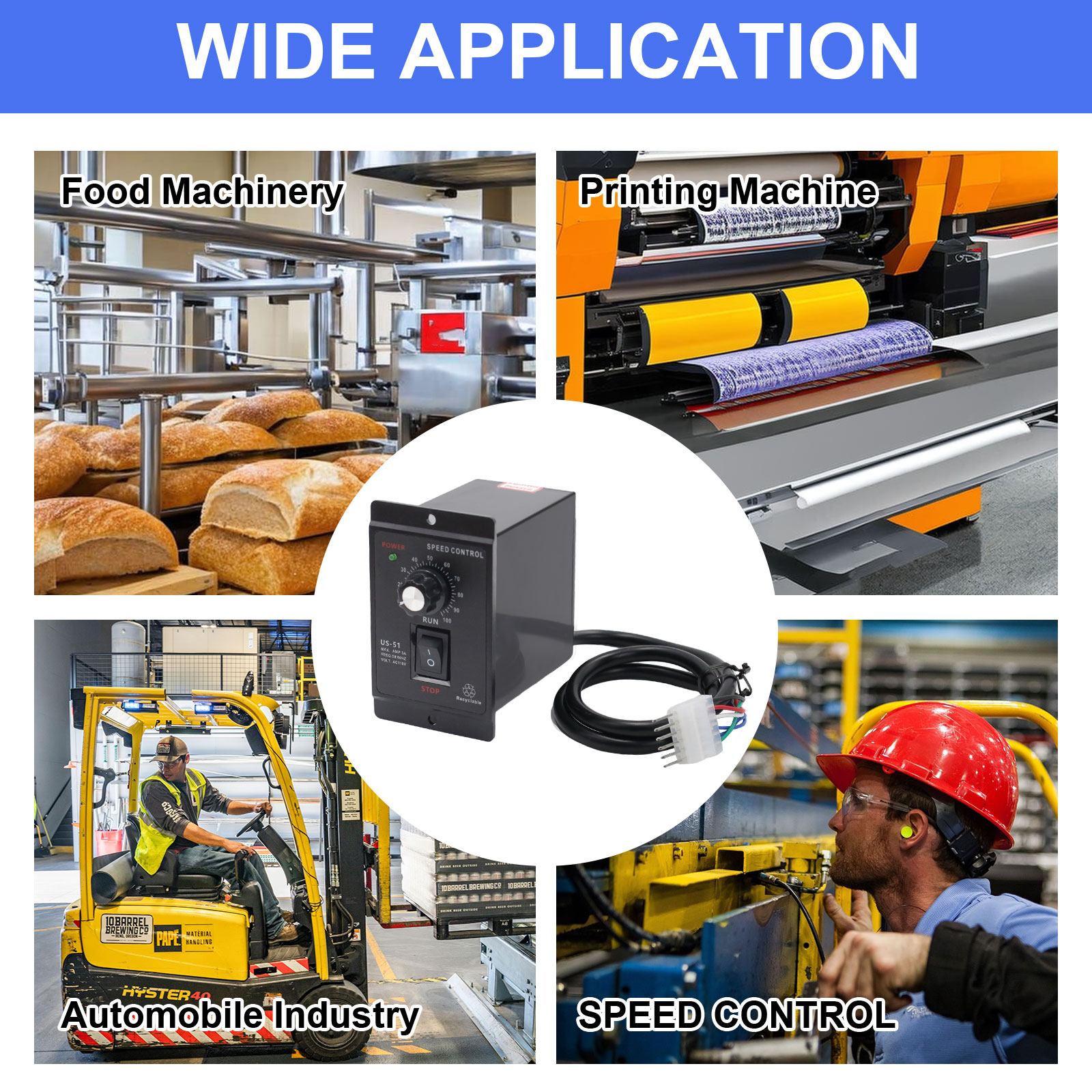 Green LED indicator, 6 terminals, on/ off switch for controlling, the knob switch for adjust the speed.Used for Machine Tools, Textile Machinery, Conveying Machine, Printing Mechanism,Food Machinery, Vending Machine, Packing Machinery, Gumming Machine, etc. I