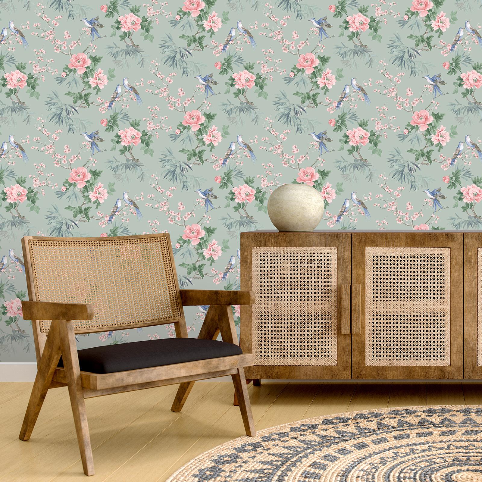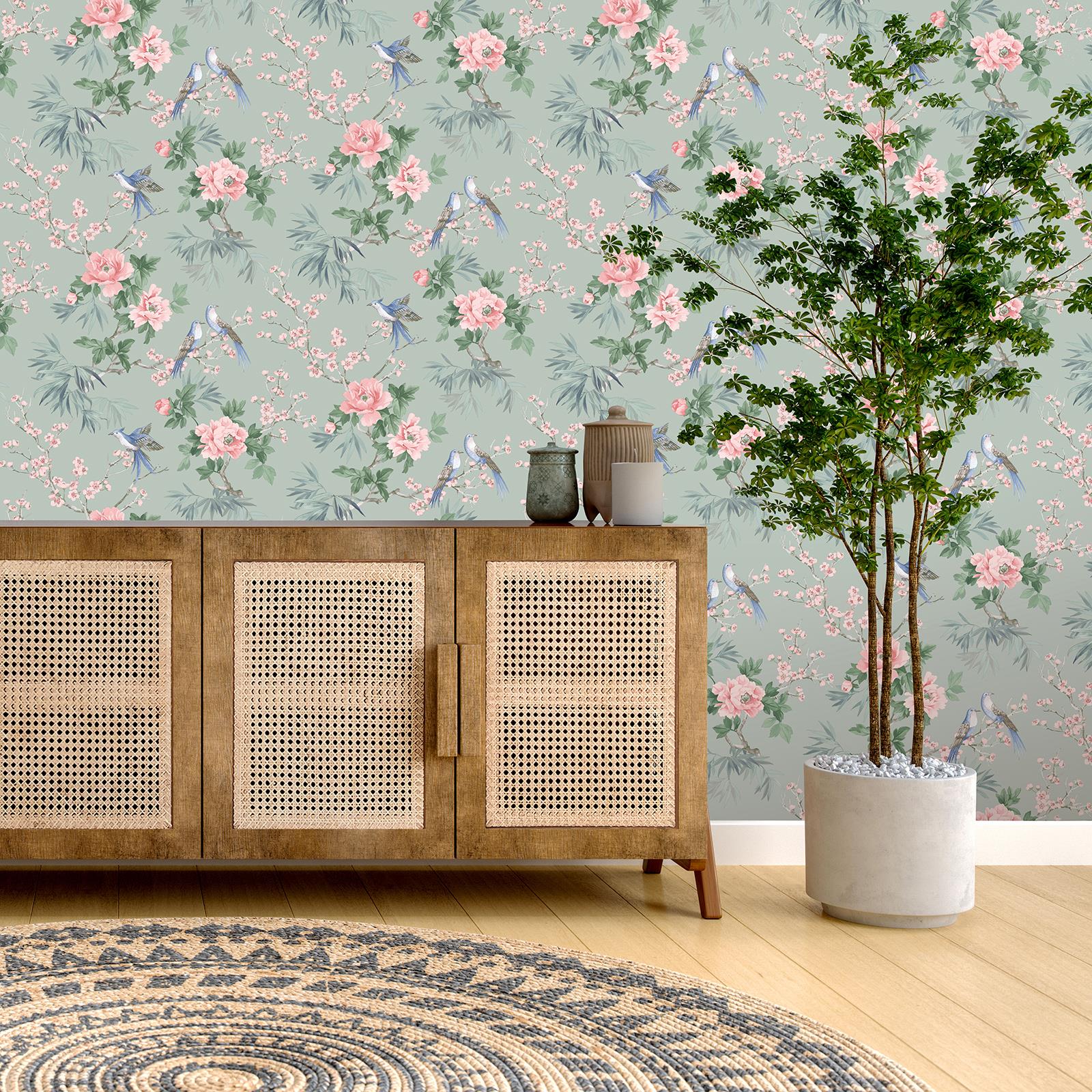 If you are looking for a timeless yet trendy design for your walls, the Amelie Chinoiserie Bird Wallpaper in this stunning sage green colourway would work perfectly. This Chinoiserie inspired pattern features birds elegantly perched amongst an abundance of trees, florals and foliage in tones of pink, set on a sage green background with a soft matte finish. This high quality and easy to use wallpaper would be an ideal choice for living rooms, studies or snugs. This design comes in a choice of three colourways and sample swatches are available to order above.