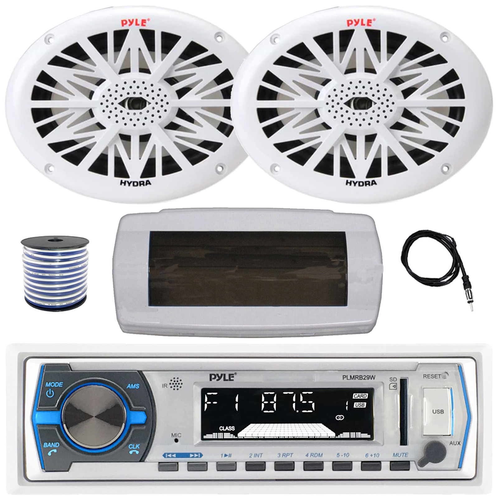 PACKAGE BUNDLE INCLUDES: Pyle PLMRB29W Single-DIN Marine Bluetooth MP3 In-Dash Stereo White Receiver W/Remote Control, White Stereo Splash Cover, 2x Pyle PLMR692 6x9" 260 Watt Max Power 2-Way Full-Range Boat White Speakers, 22" Radio Antenna, 50 Feet 18 Gauge Speaker Wire