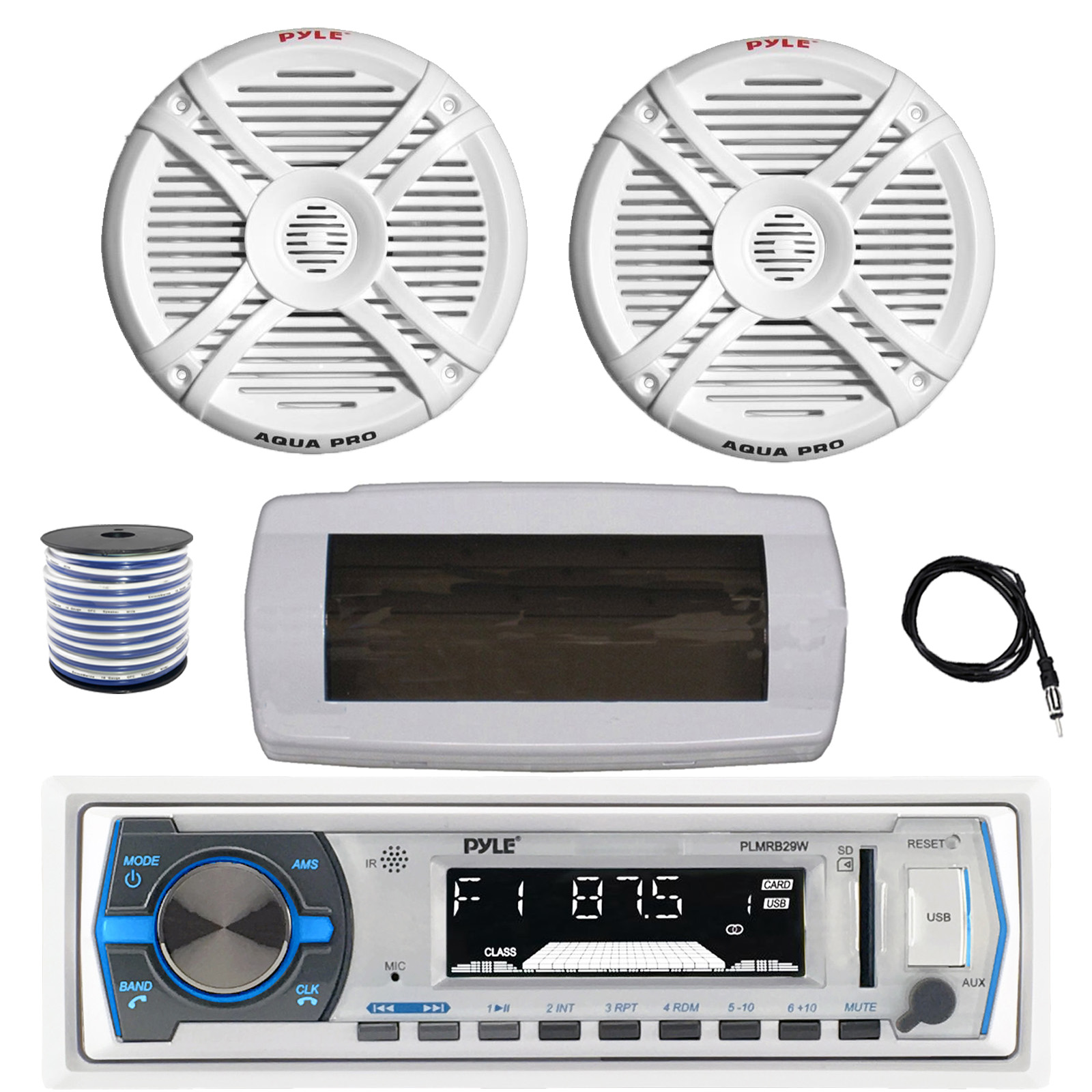 • PACKAGE BUNDLE INCLUDES: Pyle PLMRB29W Single DIN Bluetooth Marine MP3 AM/FM Stereo Receiver with White Cover, 22" Radio Antenna, Wire, 2x 7.7" 280 Watt Peak 2-Way Full Range Boat Audio Speakers (White)