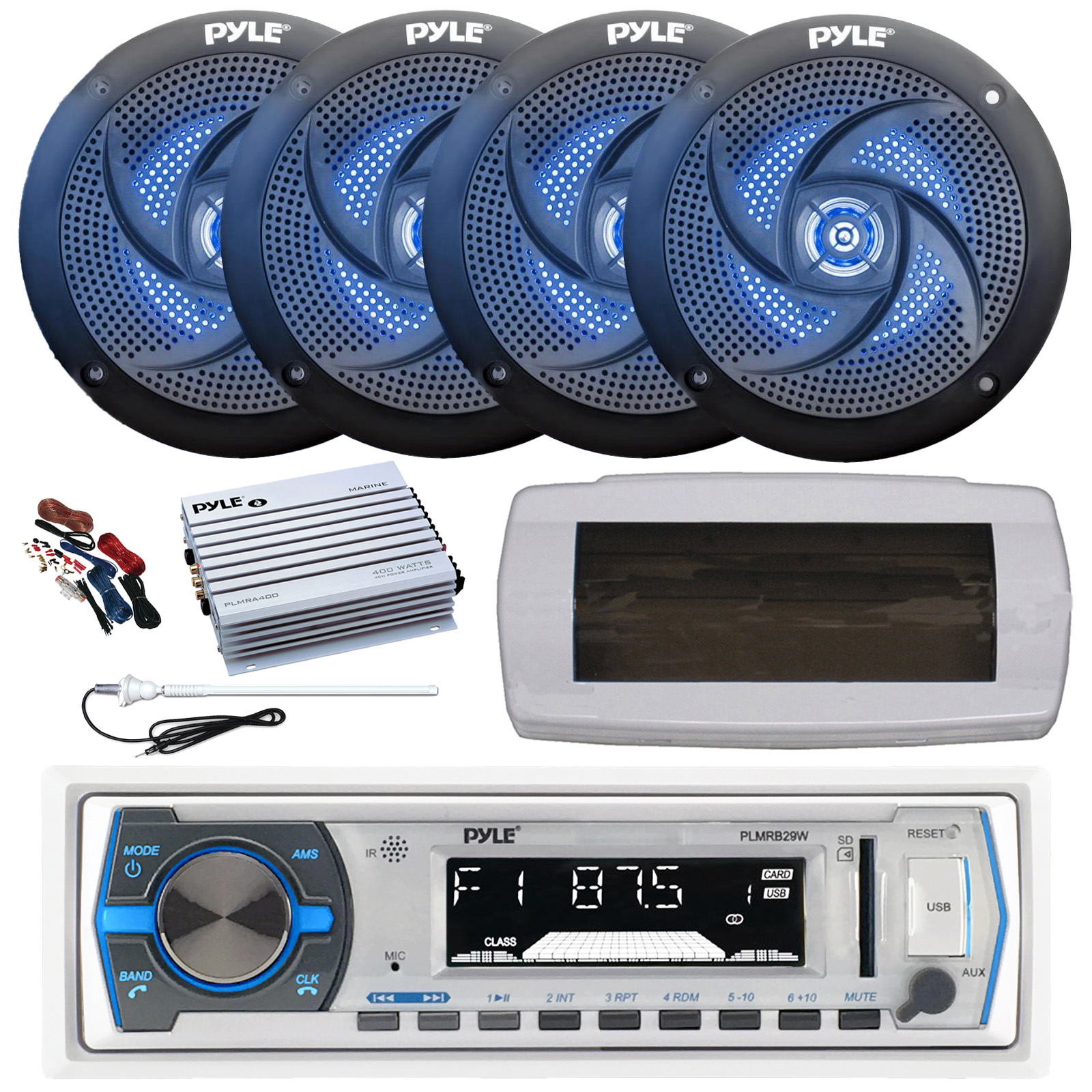 • PACKAGE BUNDLE INCLUDES: Pyle PLMRB29W Single DIN Bluetooth Marine MP3 AM/FM Stereo Receiver, White Cover, Long Range Antenna, Amplifier w/Kit, 4x 5.25" 180 Watt Max 2-Way Blue Flashing LED Boat Speakers (Black)