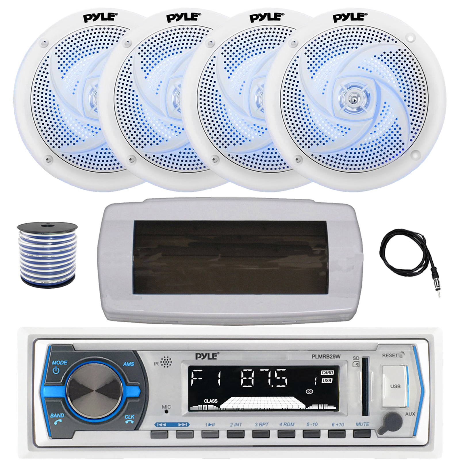 Pyle PLMRB29W Single DIN Bluetooth Marine MP3 AM/FM Stereo Receiver with White Cover, 22" Radio Antenna, Wire, 4x 5.25" 180 Watt Max 2-Way Blue Flashing LED Boat Audio Speakers (White)