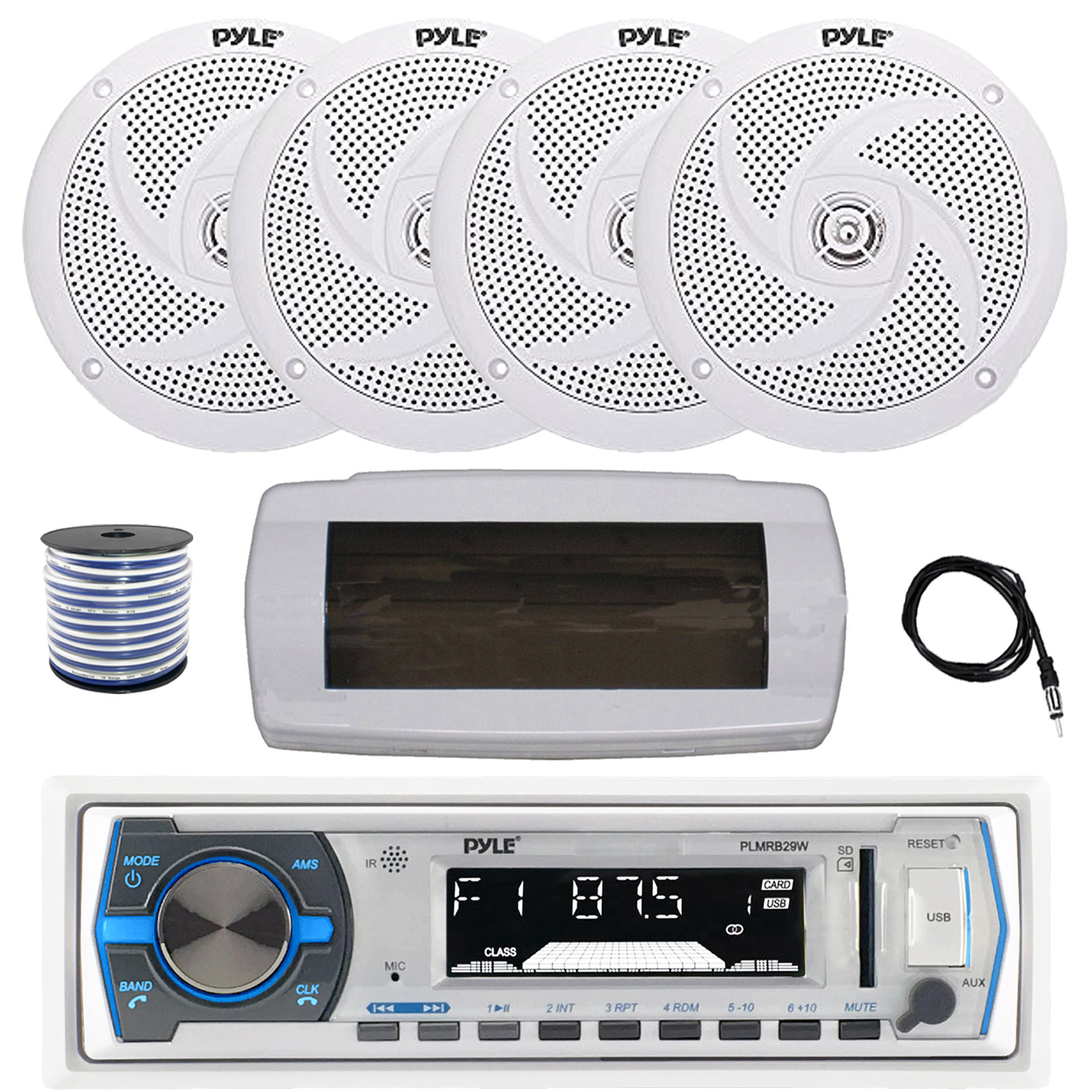• PACKAGE BUNDLE INCLUDES: Pyle PLMRB29W Single DIN Bluetooth Marine MP3 AM/FM Stereo Receiver with White Cover, 22" Radio Antenna, Wire, 4x 6'' 240 Watt Max 2-Way Boat Audio Speakers (White)