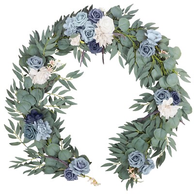 DUSTY BLUE GARLAND: Our handcrafted artificial willow eucalyptus rose garland is mainly composed of dusty blue roses, navy blue flowers, light blue roses, as well as small wildflowers and eucalyptus willow leaves.