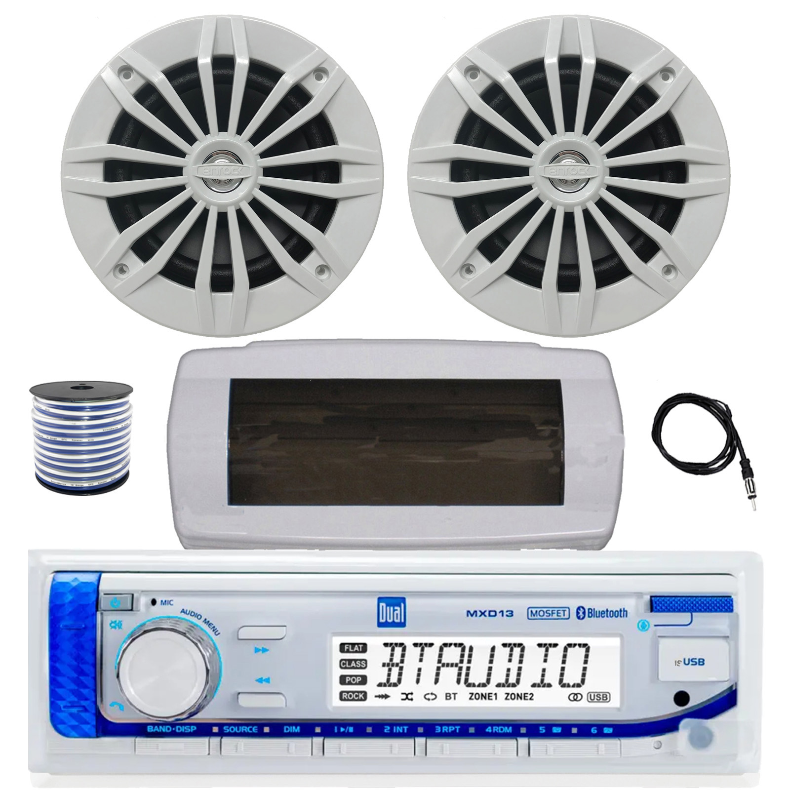 • PACKAGE BUNDLE INCLUDES: Dual MXD13 Single DIN Bluetooth Marine MP3 AM/FM Stereo Receiver with White Cover, 22" Radio Antenna, Wire, 2x 6.5" 180 Watt Max Power 2-Way Water Resistant Audio Speakers (White)
