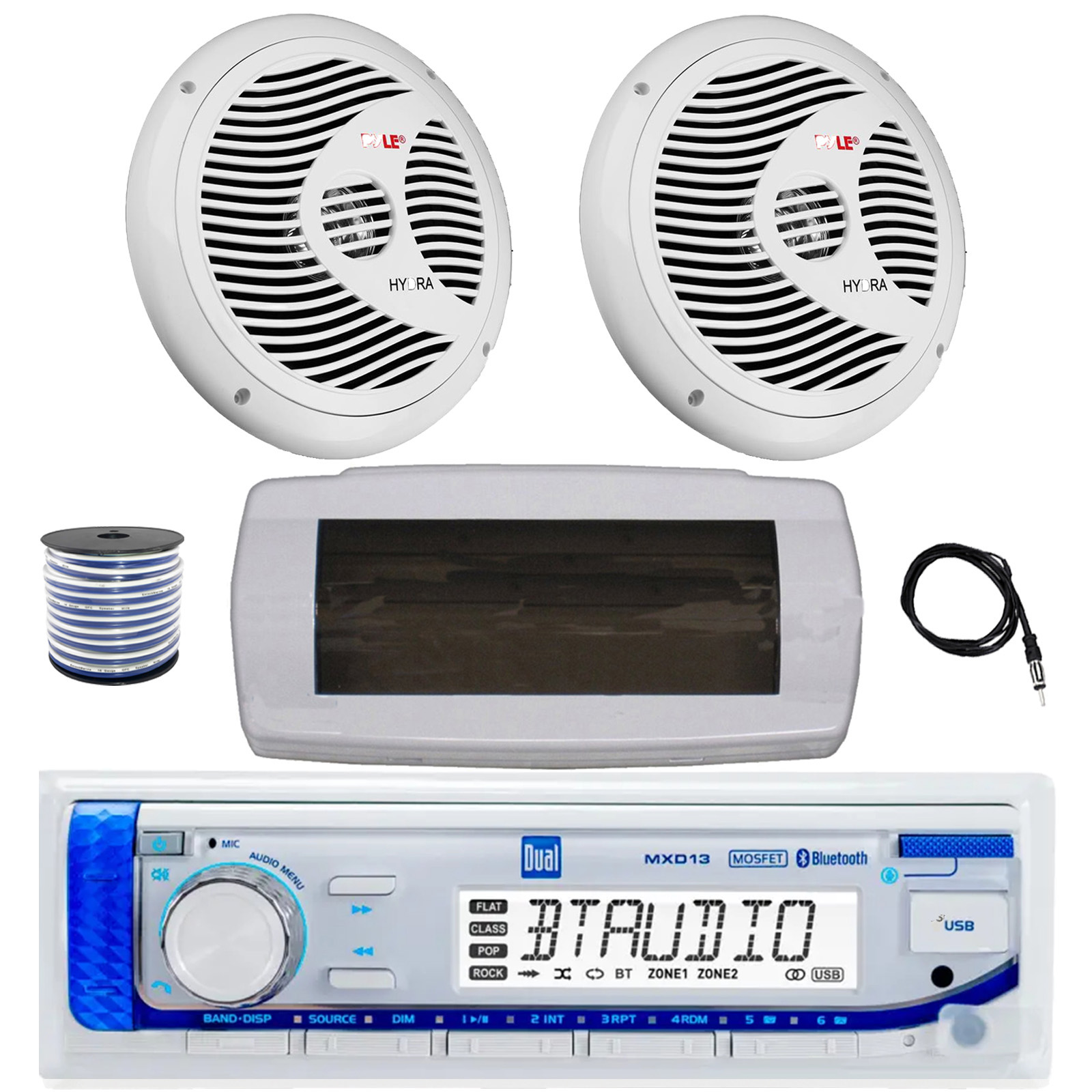 • PACKAGE BUNDLE INCLUDES: Dual MXD13 Single DIN Bluetooth Marine MP3 AM/FM Stereo Receiver with White Cover, 22" Radio Antenna, Wire, 2x 6.5" 150 Watt Max Full Range Dual Cone Waterproof Stereo Speakers (White)