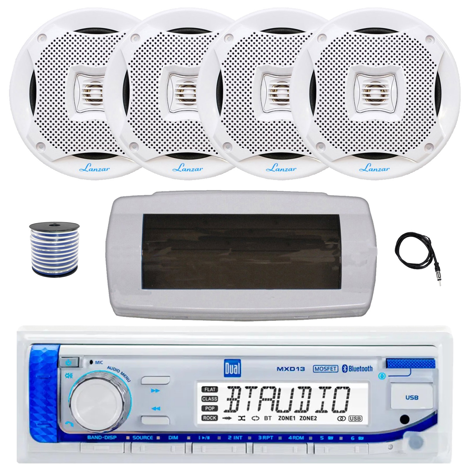 • PACKAGE BUNDLE INCLUDES: Dual MXD13 Single DIN Bluetooth Marine MP3 AM/FM Stereo Receiver with White Cover, 22" Radio Antenna, Wire, 4x 6.5" 400W Max 2-Way Water Resistant Audio Speakers (White)