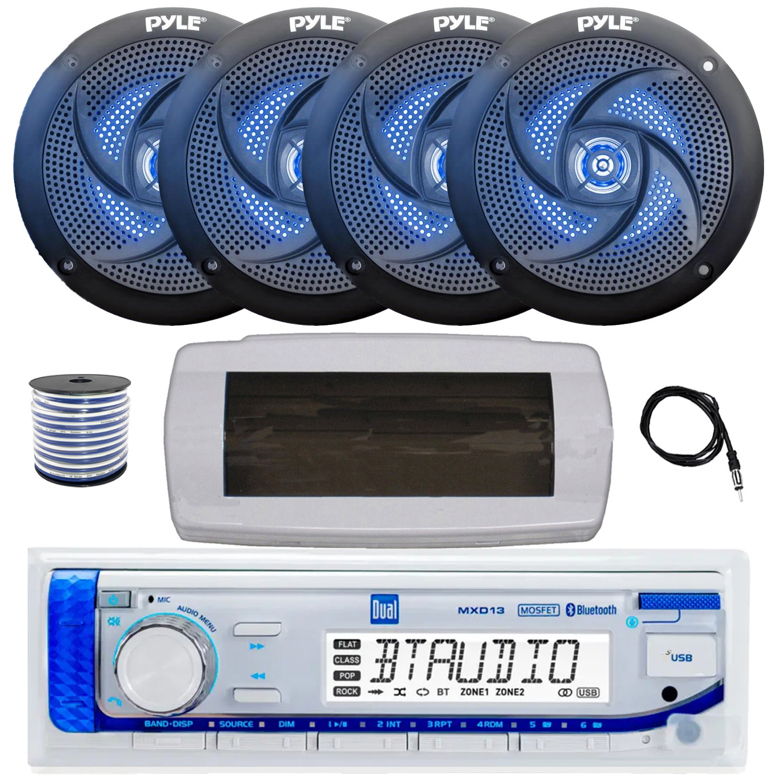 • PACKAGE BUNDLE INCLUDES: Dual MXD13 Single DIN Bluetooth Marine MP3 AM/FM Stereo Receiver with White Cover, 22" Radio Antenna, Wire, 4x 4" 100 Watt Peak 2-Way Blue Flashing LED Boat Audio Speakers (Black)