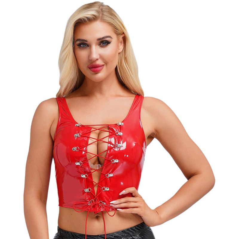 Sleeveless, wide shoulder straps vest is designed with adjustable lace-up front, grommet eyelet.