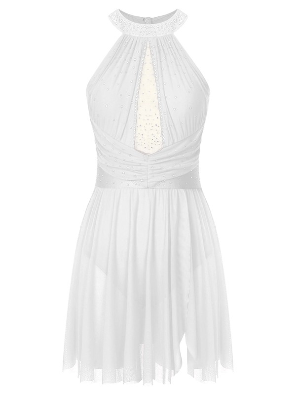 The bodice of the dance dress is adorned with shiny rhinestones to create an eye-catching effect and brighten up any performance.