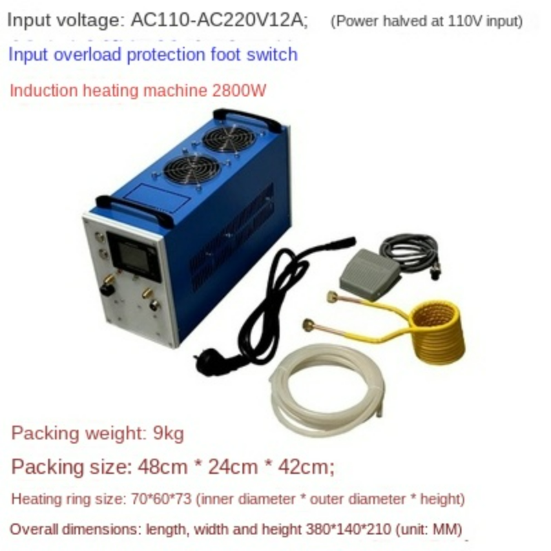 This product is a small power induction heating machine with AC110V-220V power supply. It can be used for heating and quenching of small iron metal materials. It can be used with 70mL graphite crucible to reach a maximum temperature of 1600 degrees Celsius. It can easily melt iron, gold, silver and aluminum. metal.