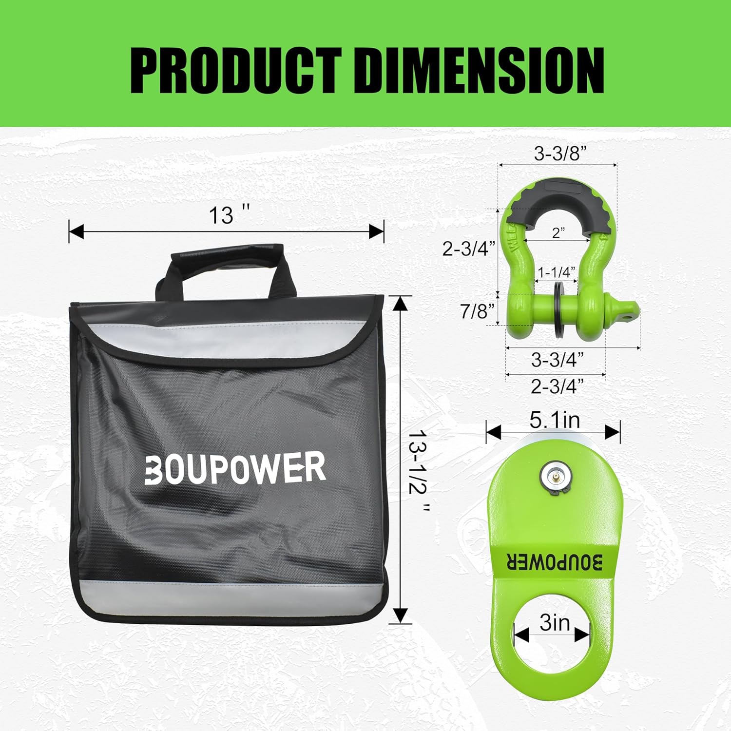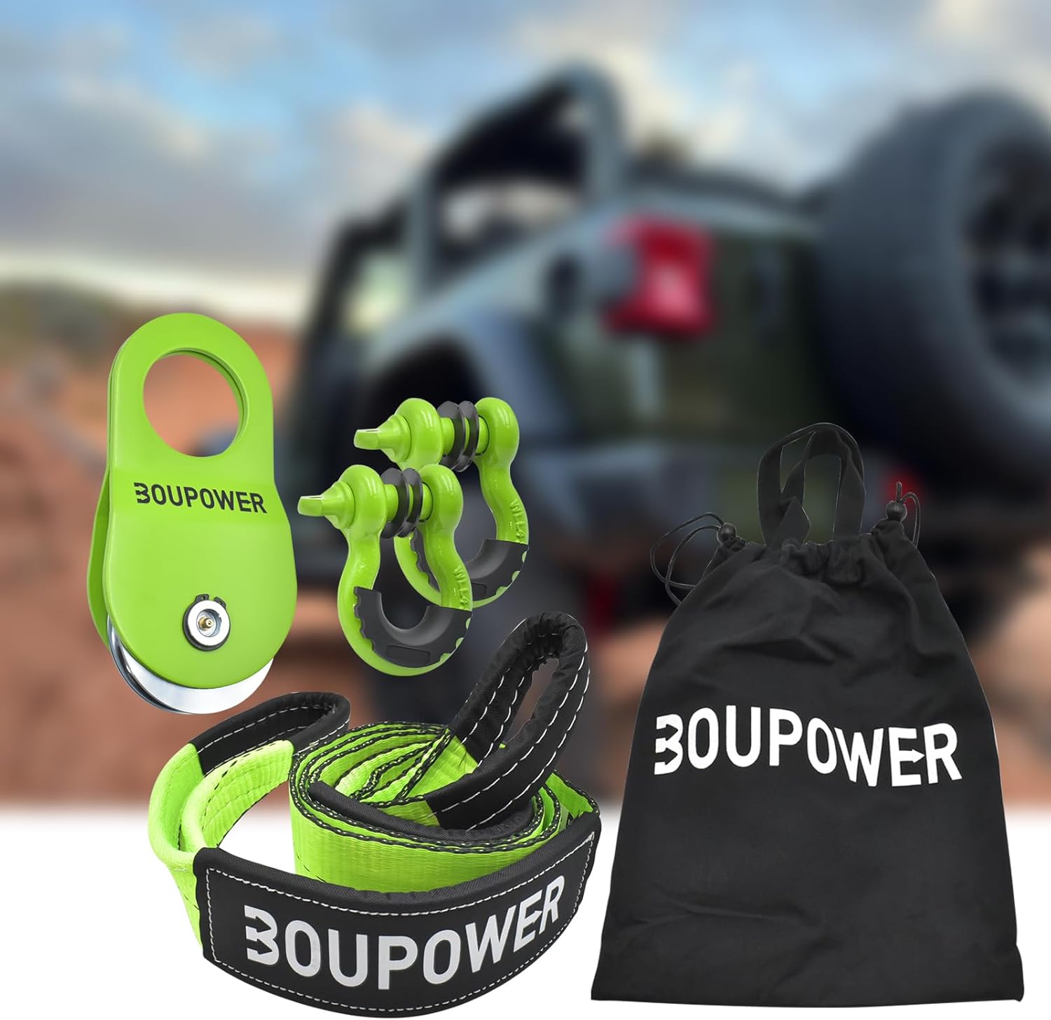OFF ROAD RECOVERY KIT 1(Green & Orange): Our tow recovery kit includes 10T snatch block pulley, 3'' x 8ft tree saver (breaking strength 35000lbs), 2pcs 3/4'' D-ring shackles and a portable storage bag.
