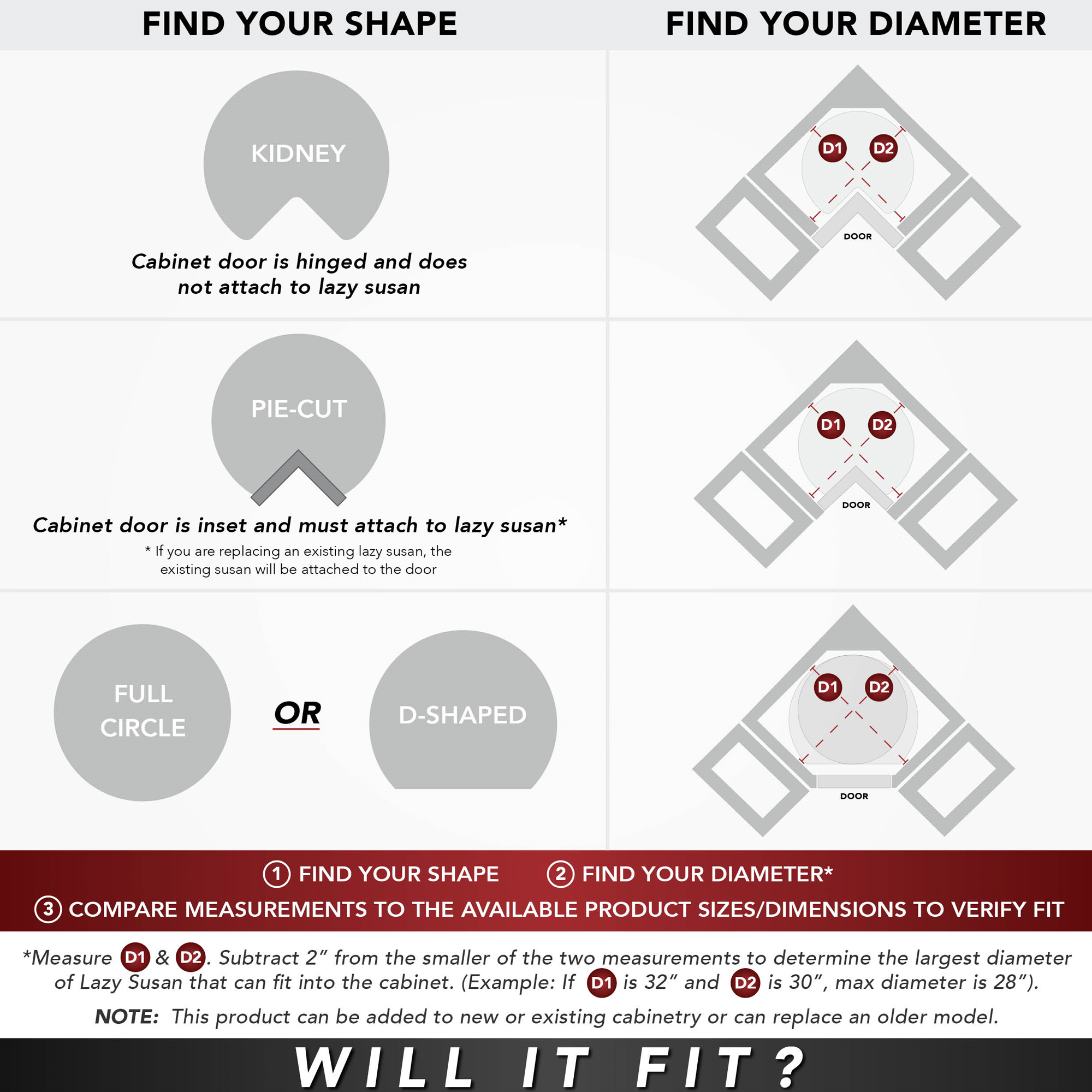 Double check your cabinet's opening (inside dimensions) to allow the best fit. Measure side to side (width), front to back (depth or length), and top to bottom (height). Double check to make sure your product is within measurements, and don't forget to take into account any obstructions (plumbing, hinges, etc.). Experience superior kitchen organization with the Rev-A-Shelf Kidney-Shaped 2-Shelf Lazy Susan.