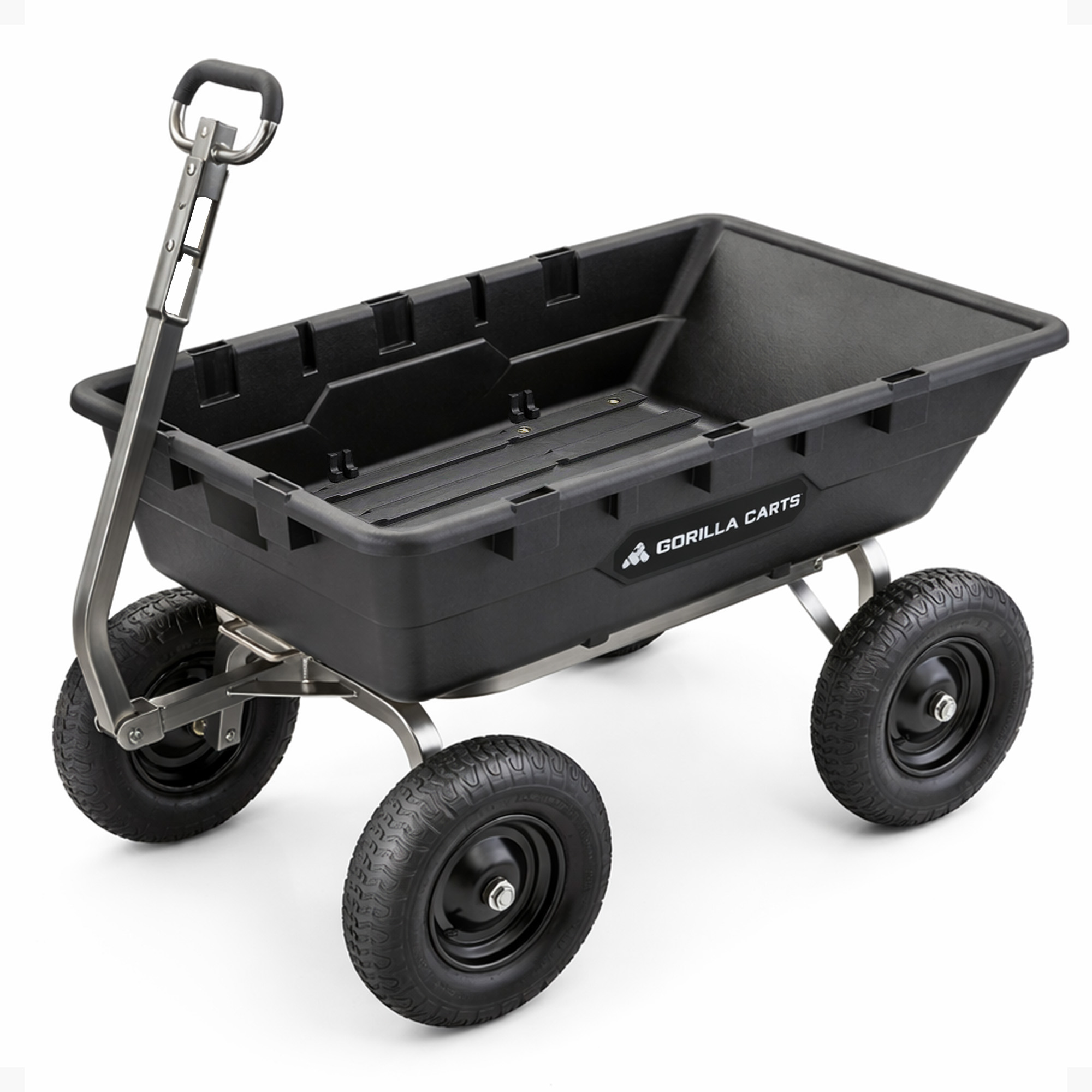 The innovative steel frame design of the wheelbarrow cart allows for quick and easy assembly. Transport rocks, mulch, and dirt for rugged use, or use as a camping cart, dog wagon, or grocery wagon! Make hauling heavy loads simple, effortless, and convenient with the Gorilla Carts Heavy-Duty Poly Yard Dump Cart.
