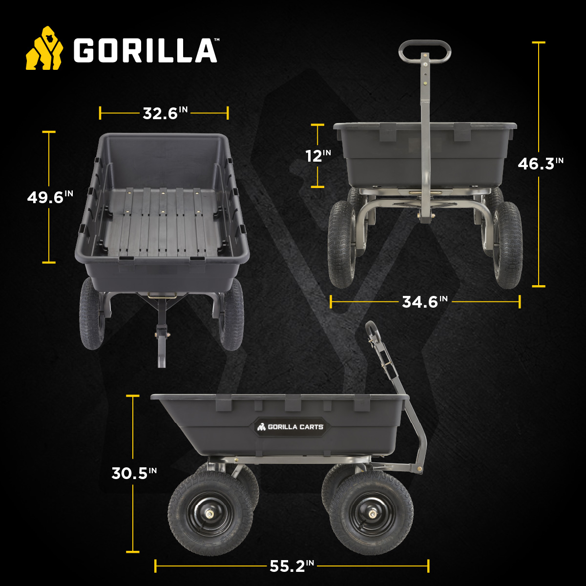 Haul heavy loads and get your items where they need to go with the Heavy-Duty Poly Yard Dump Cart from Gorilla Carts. With a carrying capacity of up to 1,500 pounds, this industrial wagon cart is great for transporting heavy objects through your yard, throughout the garden, or around the farm.