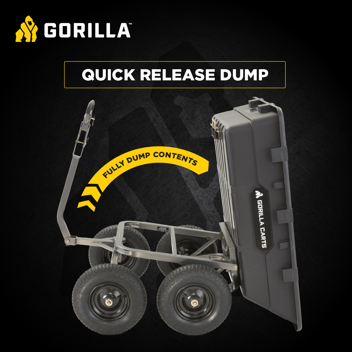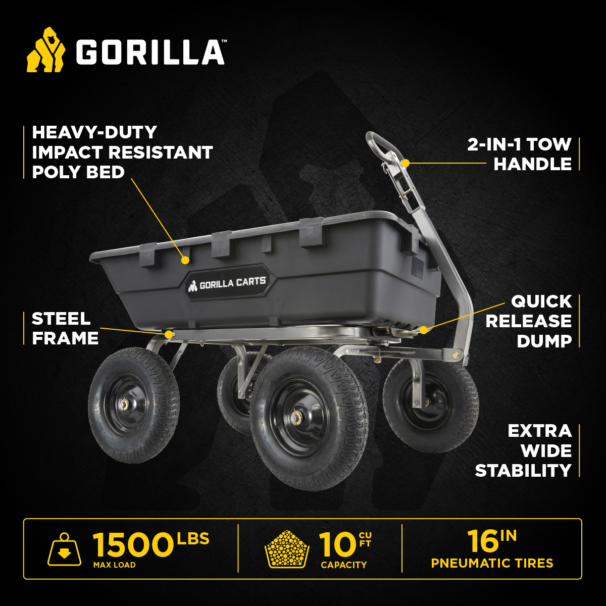 Designed with a huge bed measuring 49.6 inches long by 32.6 inches wide, this utility cart wagon provides durability when carrying heavier equipment or outdoor landscape yard items. The gorilla wagon features 16-inch pneumatic tires that ensure usability and smooth maneuvering on many different terrains, while the 1,500-pound capacity makes it easy to tackle heavy project loads whether doing work around the garden, lawn, barn, or farm. The patented quick-release dumping system of this cart with wheels allows you to easily unload whatever you're hauling and the 2-in-1 pull cart handle allows you to maneuver seamlessly with tight-turn steering. Plus, you can easily convert the yard wagon handle to a hitch for towing behind a lawn mower tractor or ATV if needed.
