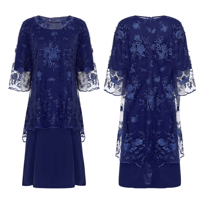 Two-piece set includes tube dress and lace cover up top. Tube dress designs with half sleeve, knee length and back zipper closure.