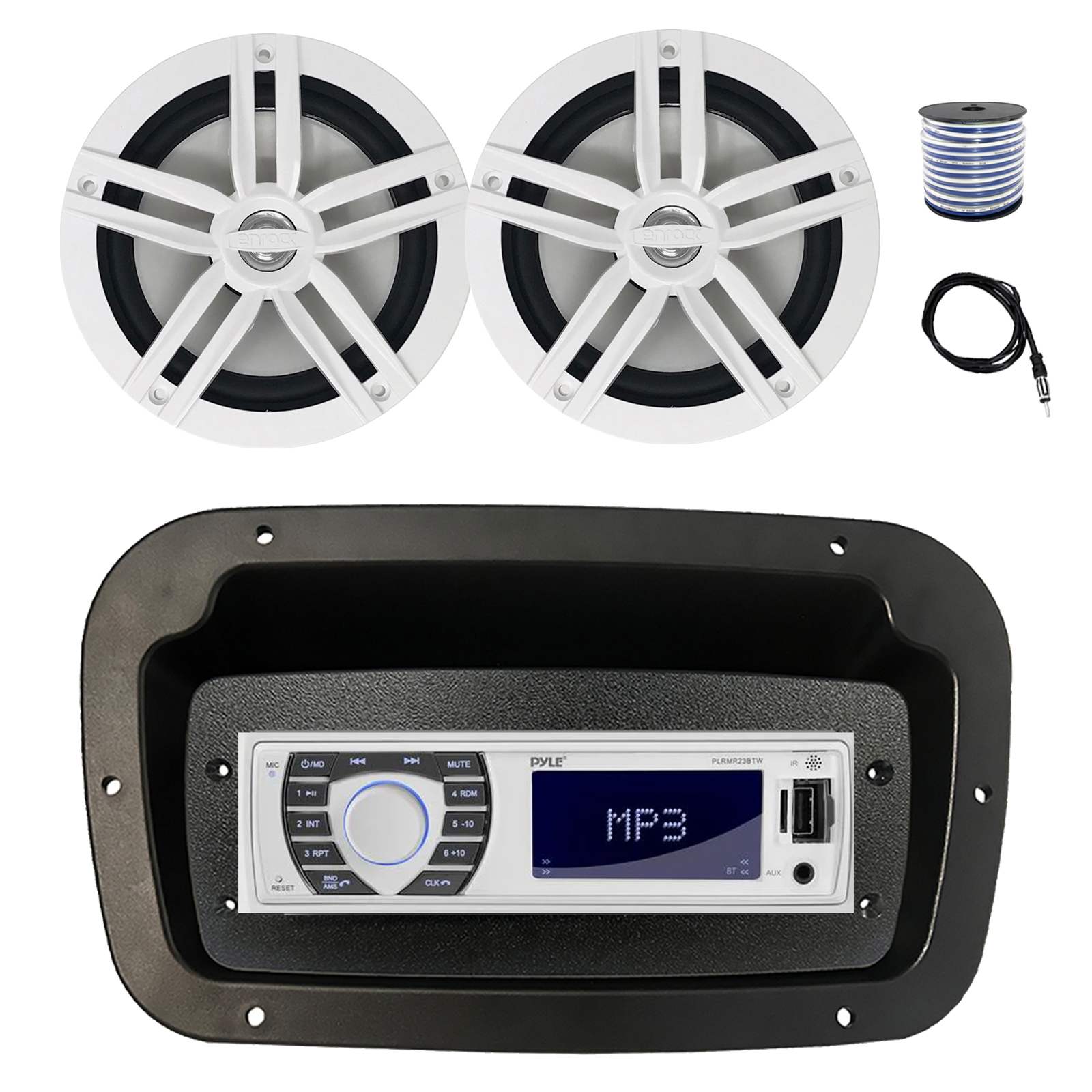Pyle PLRMR23BTW Single DIN Bluetooth Marine MP3 Stereo Receiver, Spa bezel, Adapter Plate, 22" Radio Antenna, Wire, 2x 6.5" 180 Watt Peak Power 2-Way Boat Audio Speakers (White)