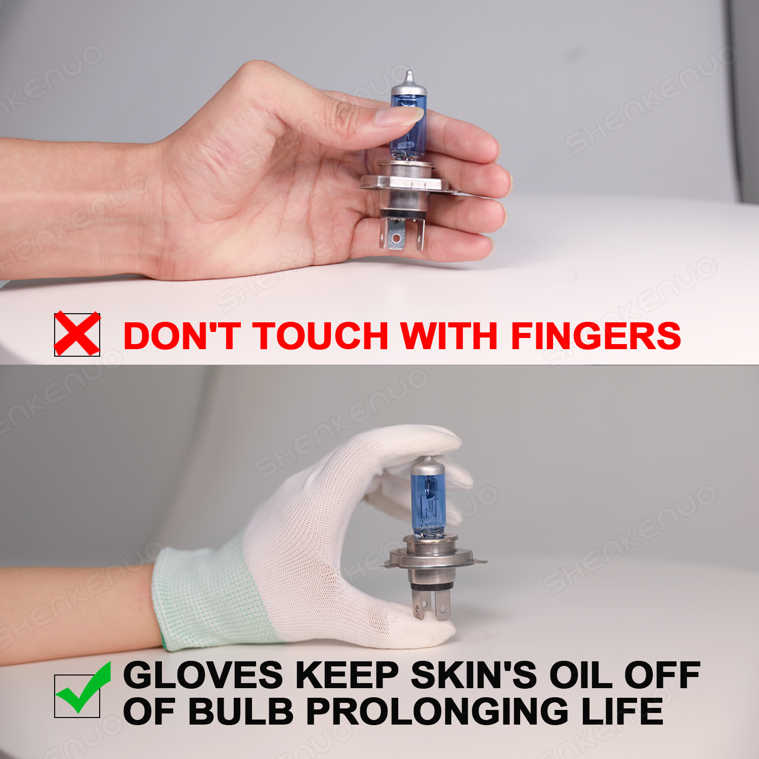 Please wear gloves when installing the halogen bulb and do not touch the glass surface of the halogen lamp directly with your hands! Moisture from your hands that is transferred to the bulbs will reduce the life span and quality of the output of the bulbs.