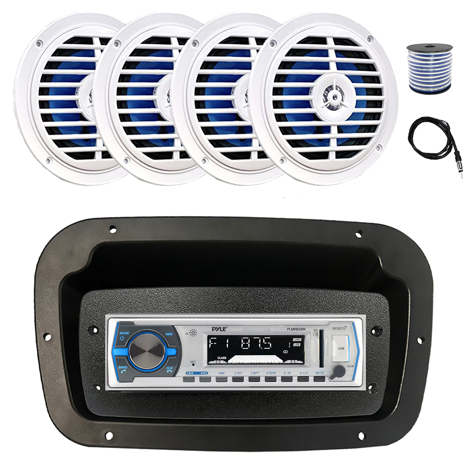 Pyle PLMRB29W Single DIN Bluetooth Marine MP3 Stereo Receiver, Spa bezel, Adapter Plate, 22" Radio Antenna, Wire, 4x 5.25'' 100 Watt Peak Full Range Dual Cone Waterproof Stereo Speakers (White)