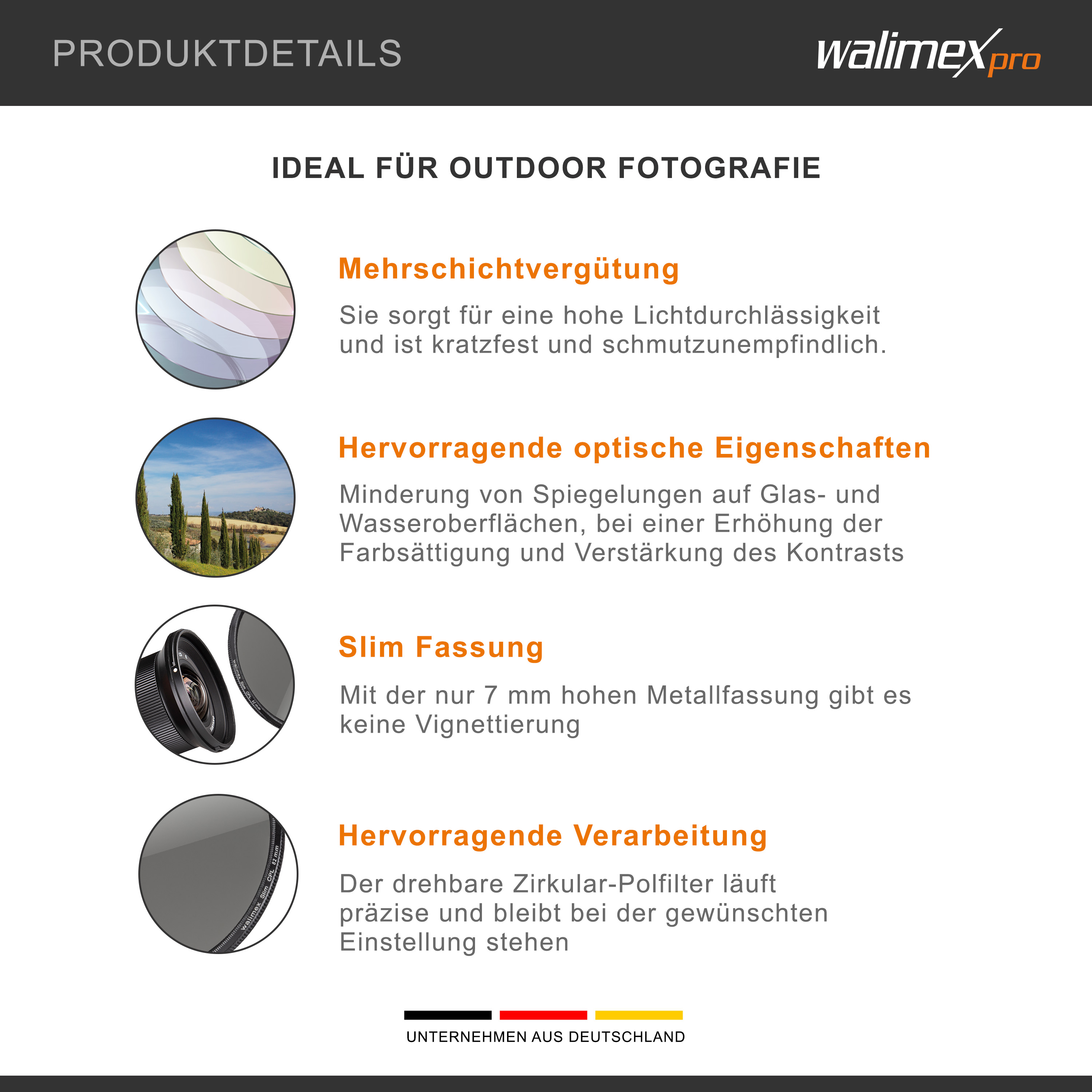 | Zubehör | • 1x Walimex Slim Polfilter Zirkular 82 mm, inkl. Schutzhülle |