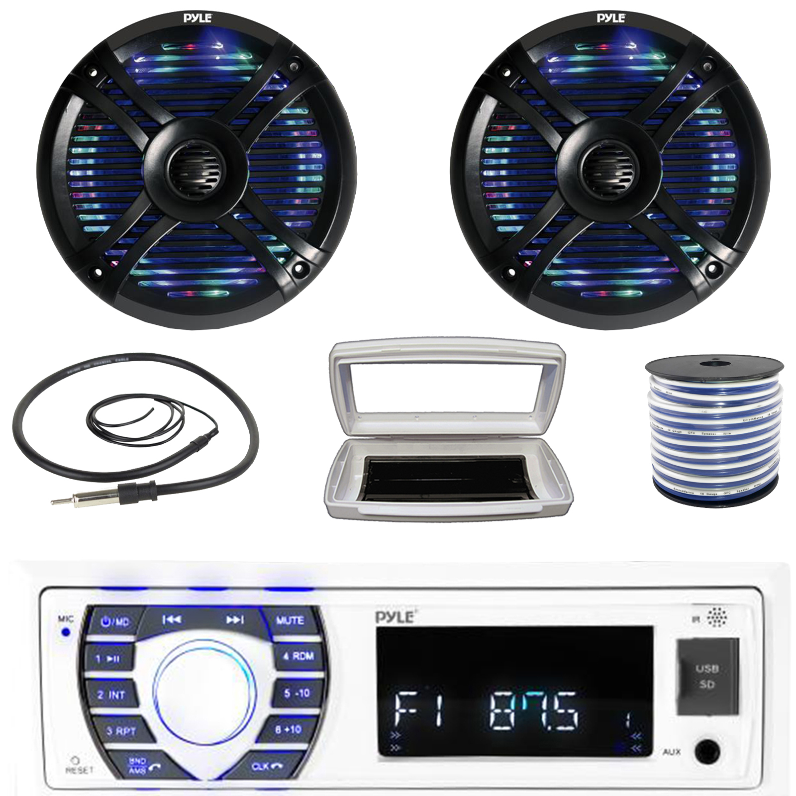 PACKAGE BUNDLE INCLUDES: Pyle PLRMR23BTW Single-DIN Bluetooth Marine USB/AUX MP3/SD AM/FM Radio Stereo Receiver W/White Marine Stereo Splash Cover, 2x Pyle PLMRX68LEB 6.5" 250W Max Power Waterproof Boat Dual Multi Color LED Black Speakers, 50 Feet 18 Gauge Speaker Wire, 22" Radio Antenna