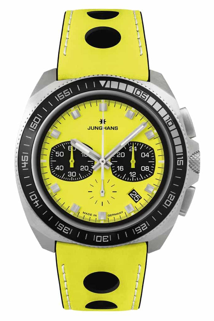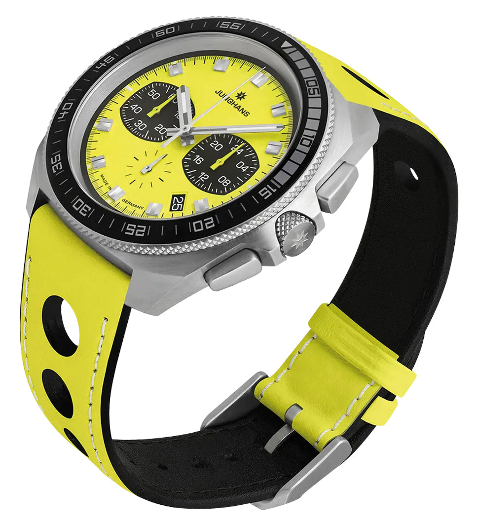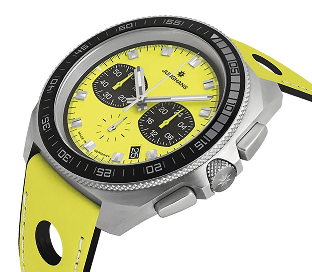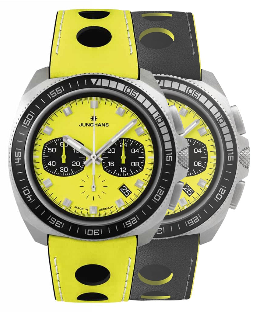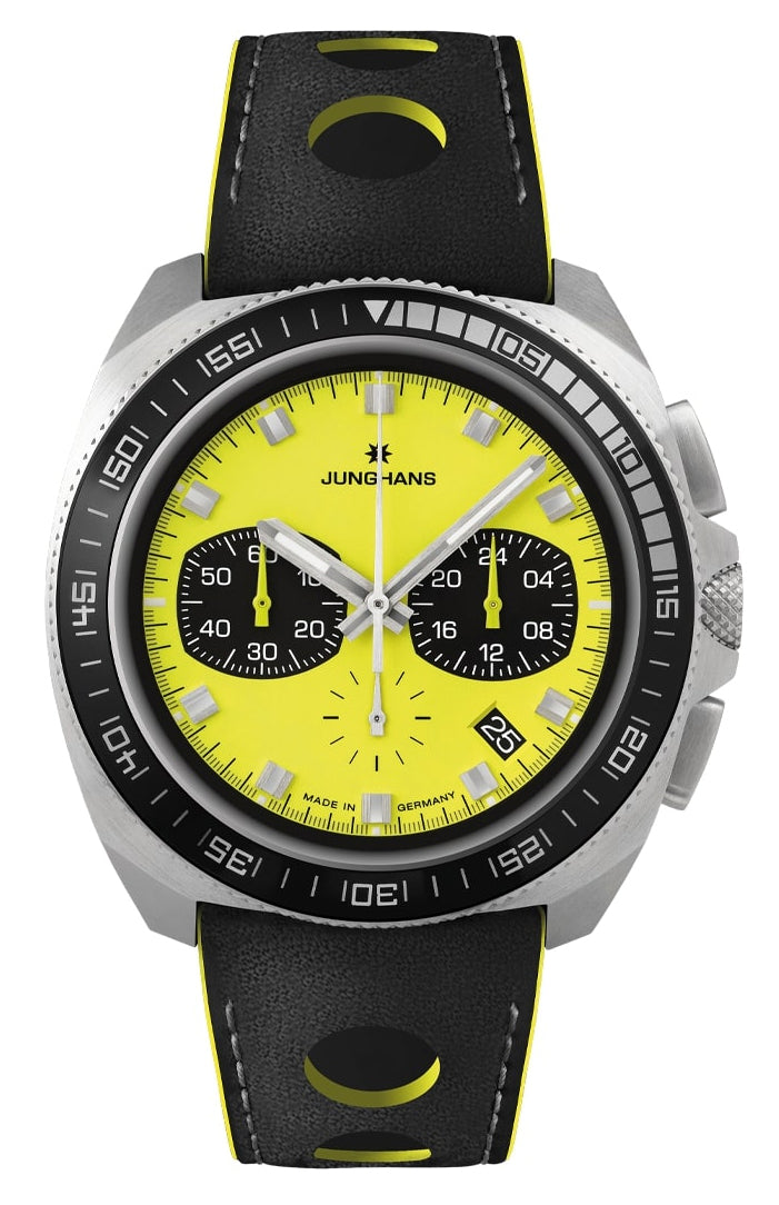 Junghans 1972 Chronoscope FIS Lemon Chronograph Stainless Steel Yellow Dial Yellow Leather Strap Interchangeable Black Leather Strap Date Quartz Mens Watch Model# 41/4369.00 / 41-4369.00