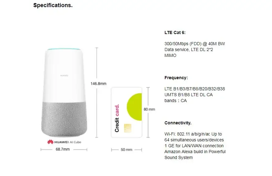 * Main features: Huawei Hilink, Huawei Histen, Amazon Alexa, Far Field Voice Recognition